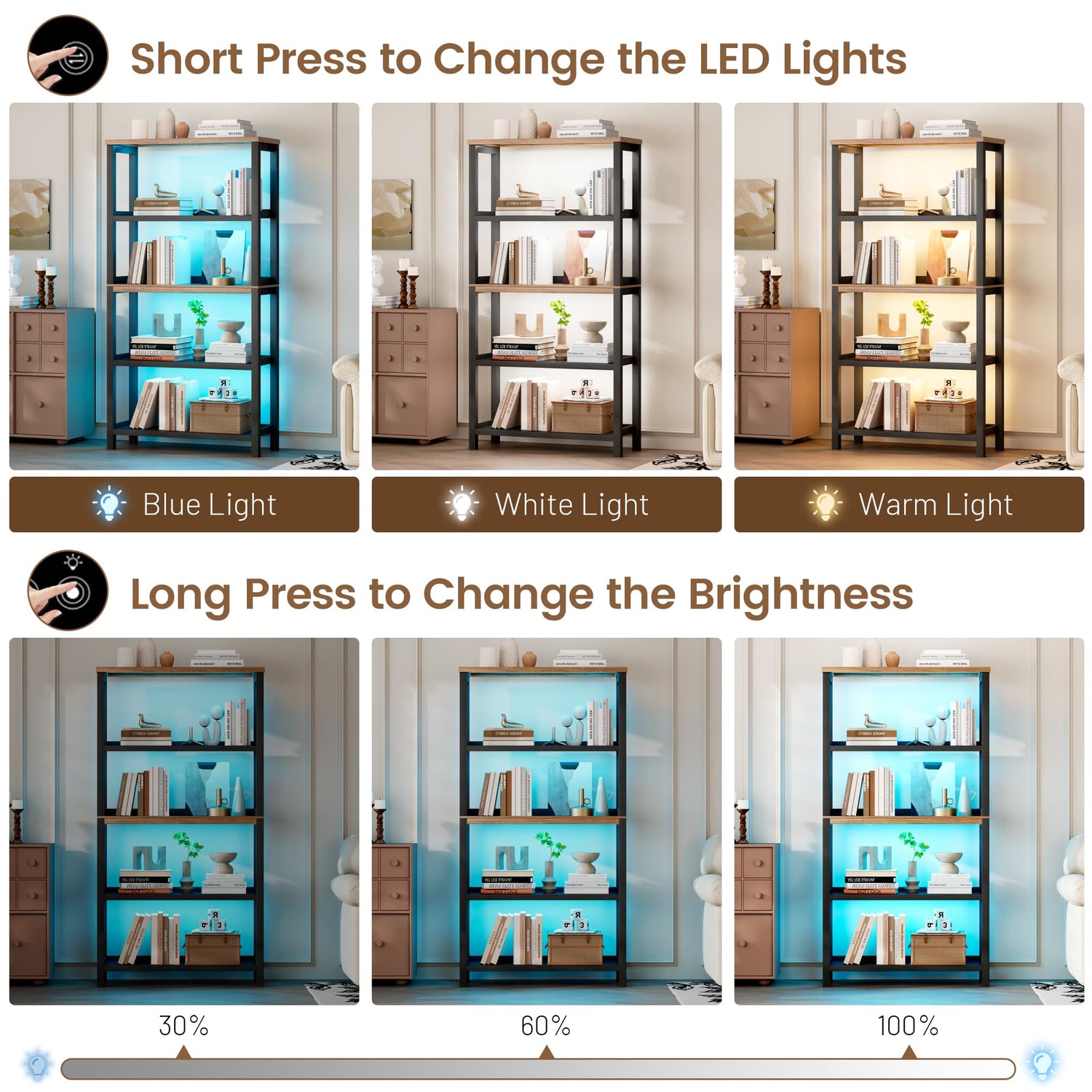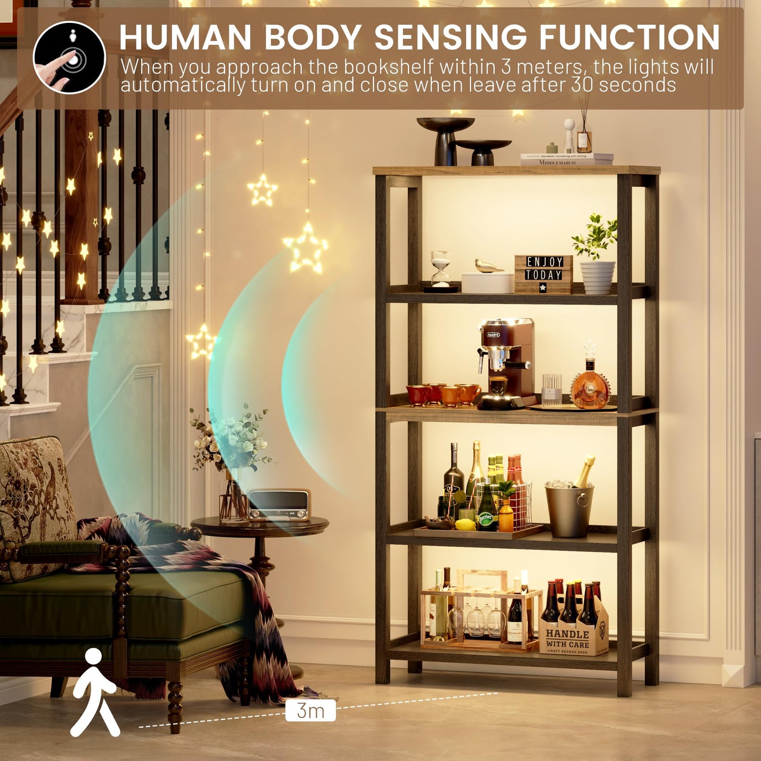 - 【Smart Human Bookshelf】Upgrade your reading experience with our 5 shelf bookcase, featuring touch-free lighting control. Simply walk within 1-3 meters, and the built-in PIR motion sensor will automatically turn on the light. Saving energy while adding modern convenience