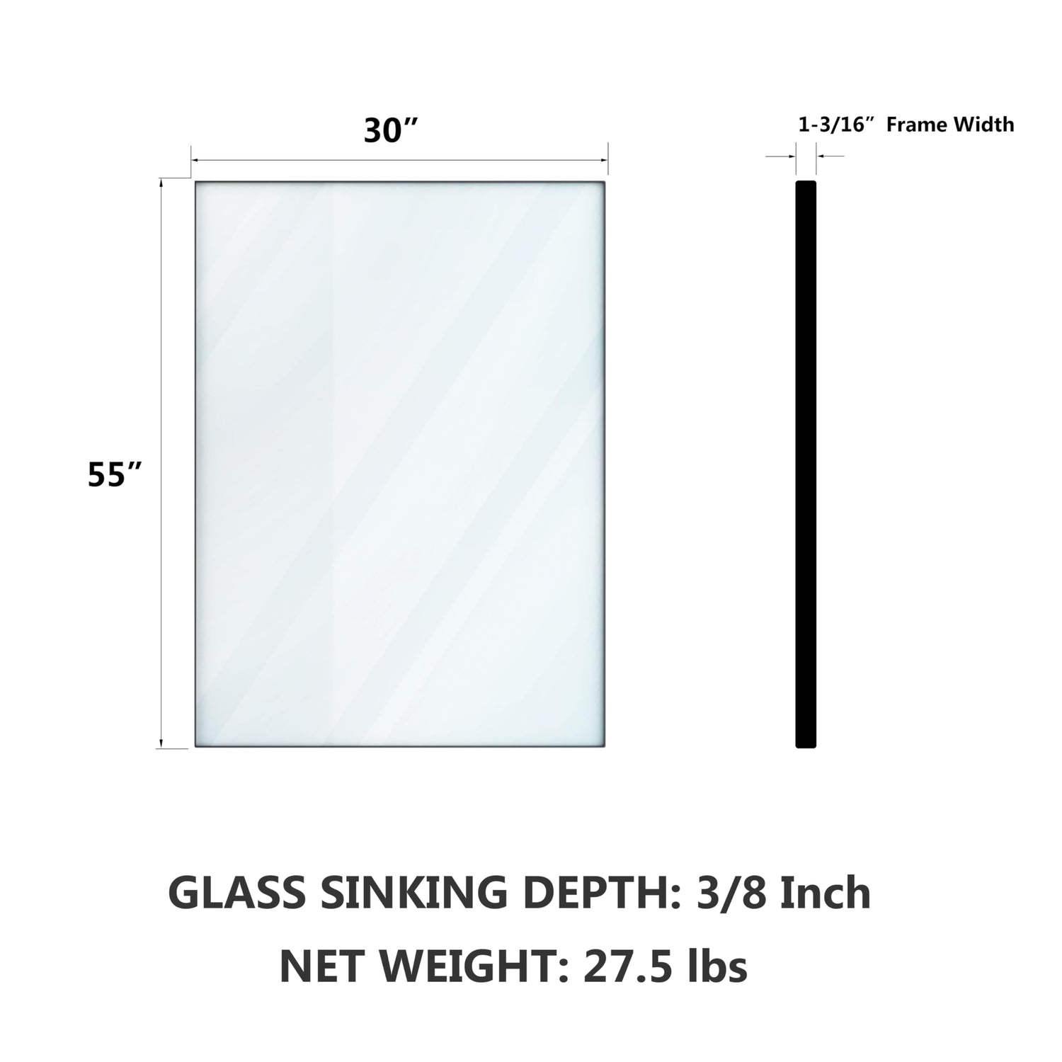 - The Mirror's outside frame measures 55 x 30 inches, with a 0.6-inch insert depth, perfect to put over a bathroom vanity or any space you need to add a touch of style