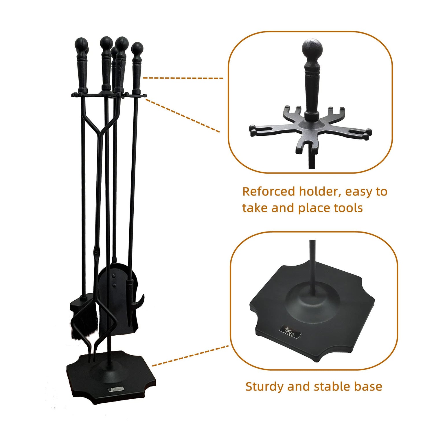 - Cast Iron Fireplace Tools- This heavy tool sets feature with an attractive antique rust finish and the cast iron material, which makes the fire place tool sets stand and toolset easily withstand the heat of fire,and also the heavy plate base makes the set more sturdy, which ensures the tools last for years.