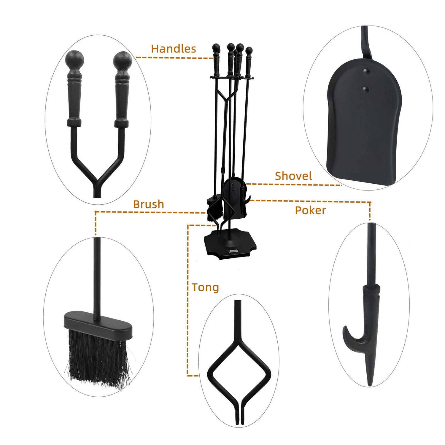 - Multi-Function Tools- This black fireplace accessories set, fire place decoration toolset includes sturdy stand with heavy base, brush broom, antique shovel, tong, fire pit poker. Each of them has a firm handle with an orb at the top. This sturdy fireplace tools set can serve your indoor/outdoor fireplace, stone stove, or wood stove for a long time.