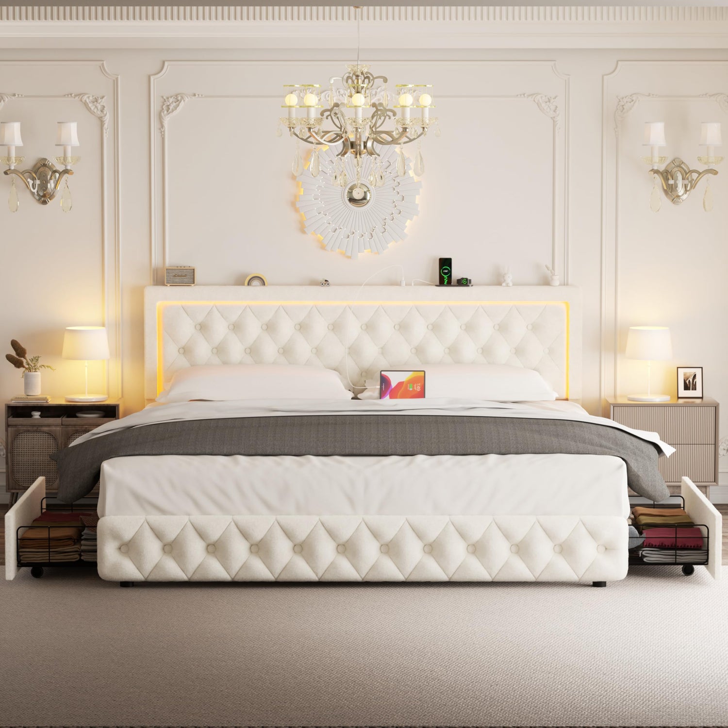 VOHOBY Queen Bed Frame with 4 Storage Drawers, Velvet Upholstered Bed Frame Queen Size with Charging Station and LED Lights, 46" Adjustable Button Tufted Headboard, No Box Spring Needed, Beige