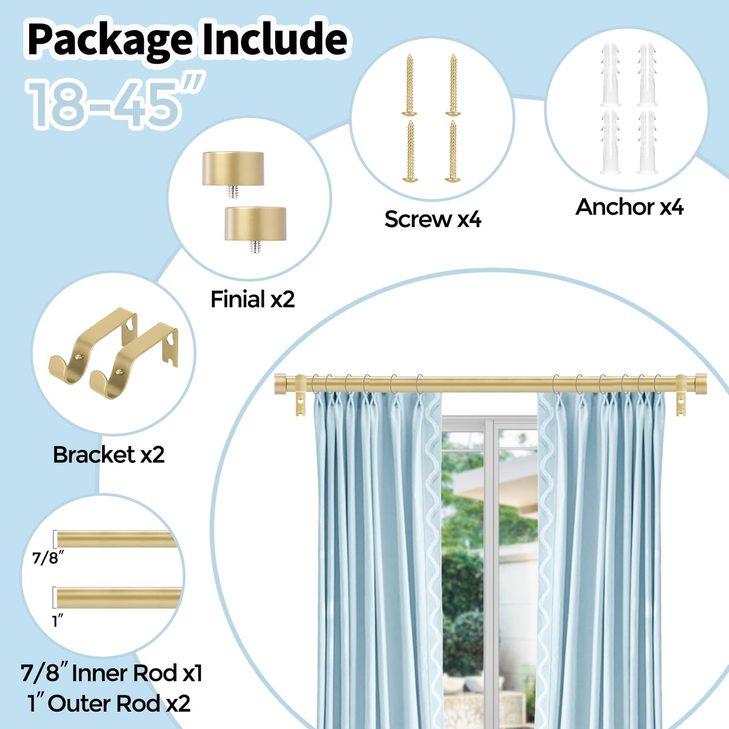 - 18''-45'' Package Includes: 16'' rod*3 (7/8'' telescopic rod*1, 1'' fixed rod*2) 2 finials , 2 brackets, 4 screws , 4 anchors and 1 connector.