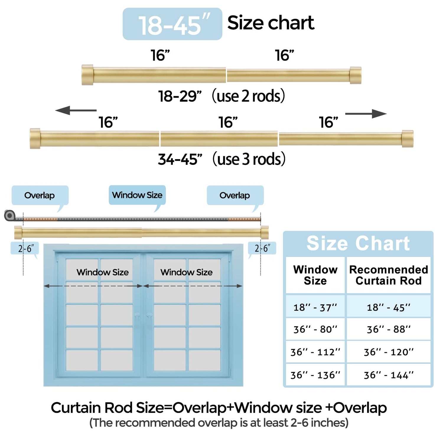- Easy to Adjustment Size: VOIIY curtain rods are made up of several 16'' rods of the same size, which can be freely spliced to the size you want. Our black curtain rods feature easy splicing installation, so you can easily resize them. Simply add or remove sections of the rod to achieve a perfect fit with your windows. Please measure your window size before you buy and choose the size of curtain rod that best fits your window based on the calculations we provide.