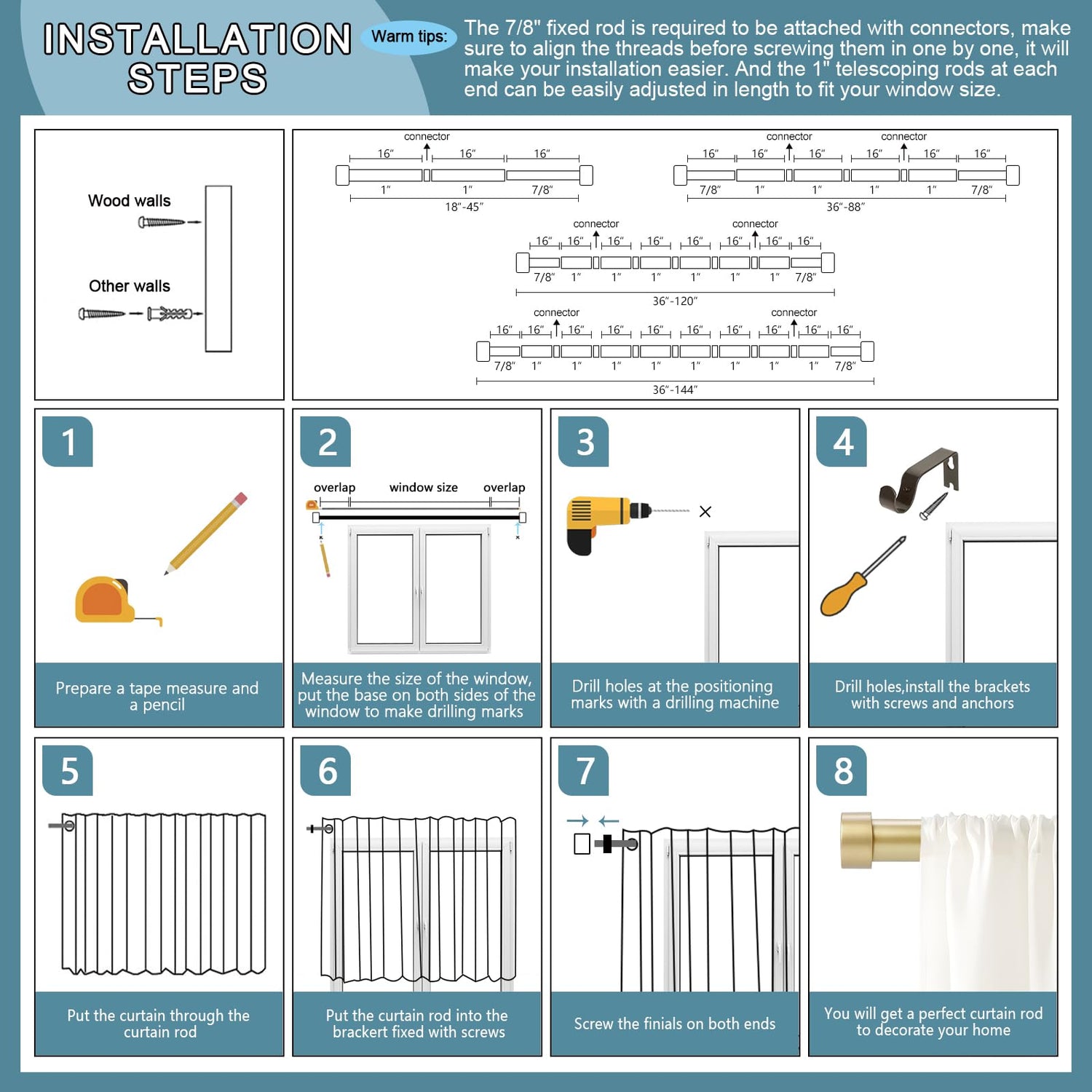- Easy Installation: Our curtain rods come with all the hardware and easy to follow quick and simple installation instructions. Spend less time installing and more time enjoying your beautiful curtain rod.During the installation process, please let the fixing rod and threads align correctly, then twist the installation slowly, this will save you more installation time and most importantly allow you to install it perfectly.