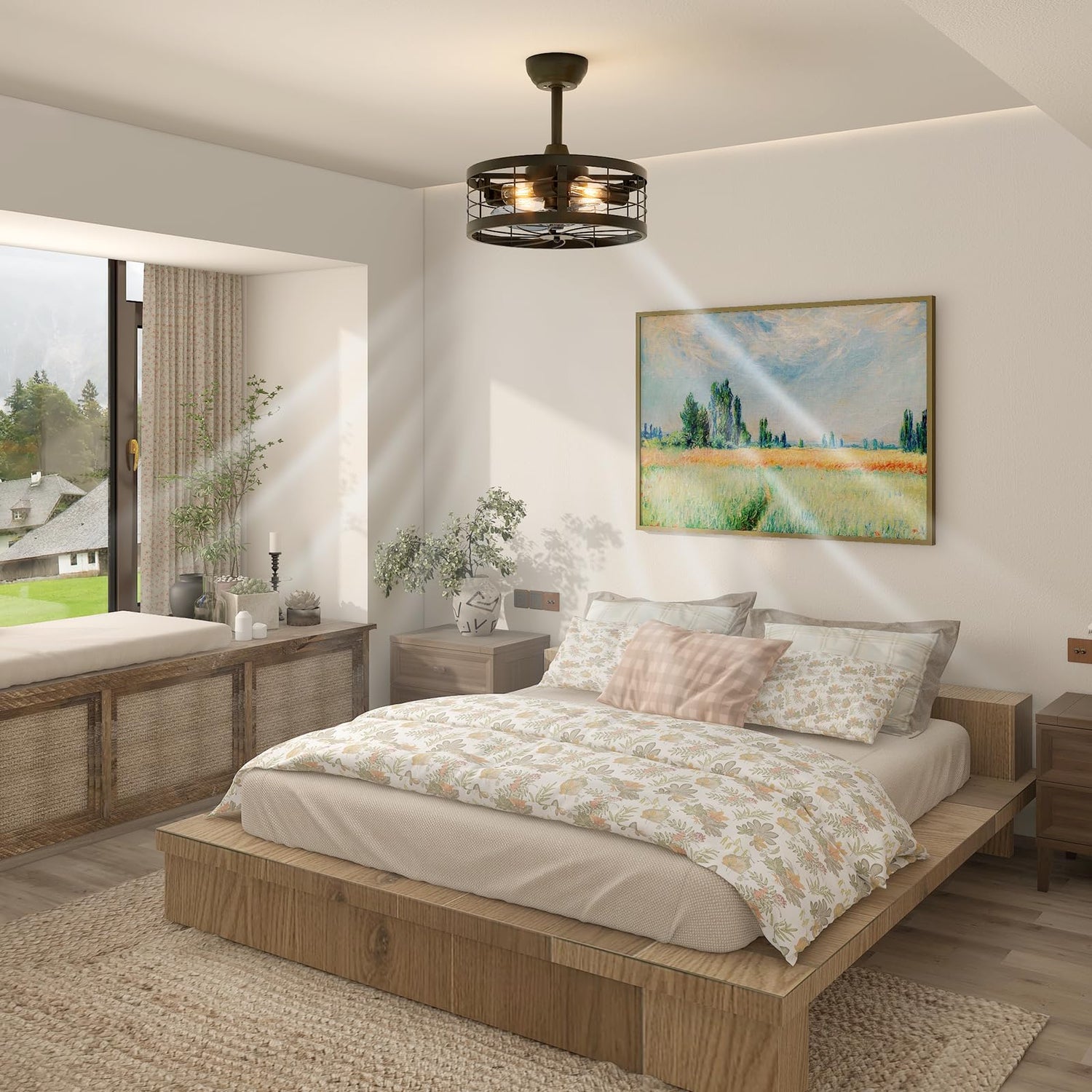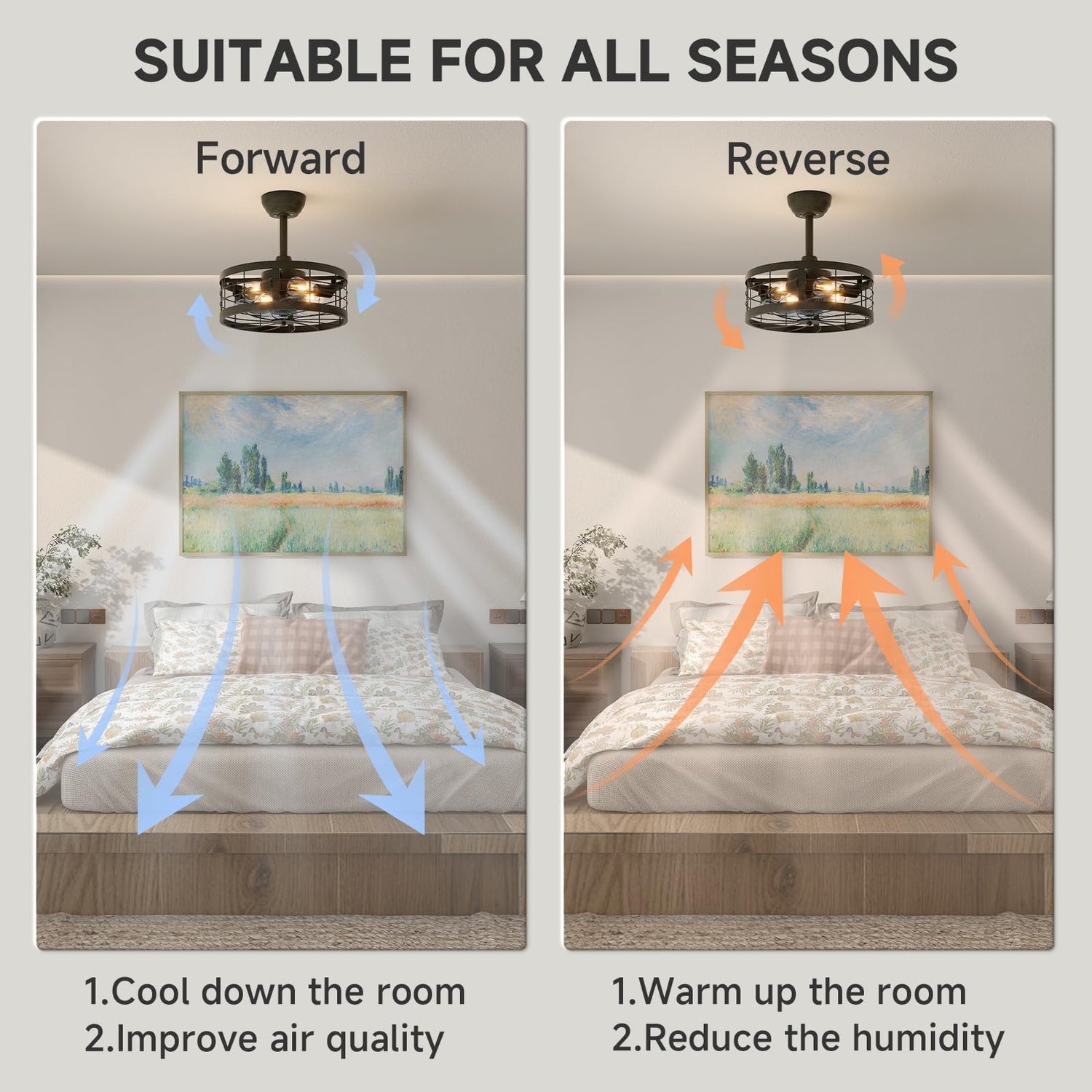 VOLISUN Caged Fandelier with Light and Remote, 16.5in Black Bladeless Ceiling Fan Lights Fixtures for Kitchen, Bedroom (4 * 2700K Bulbs Included)