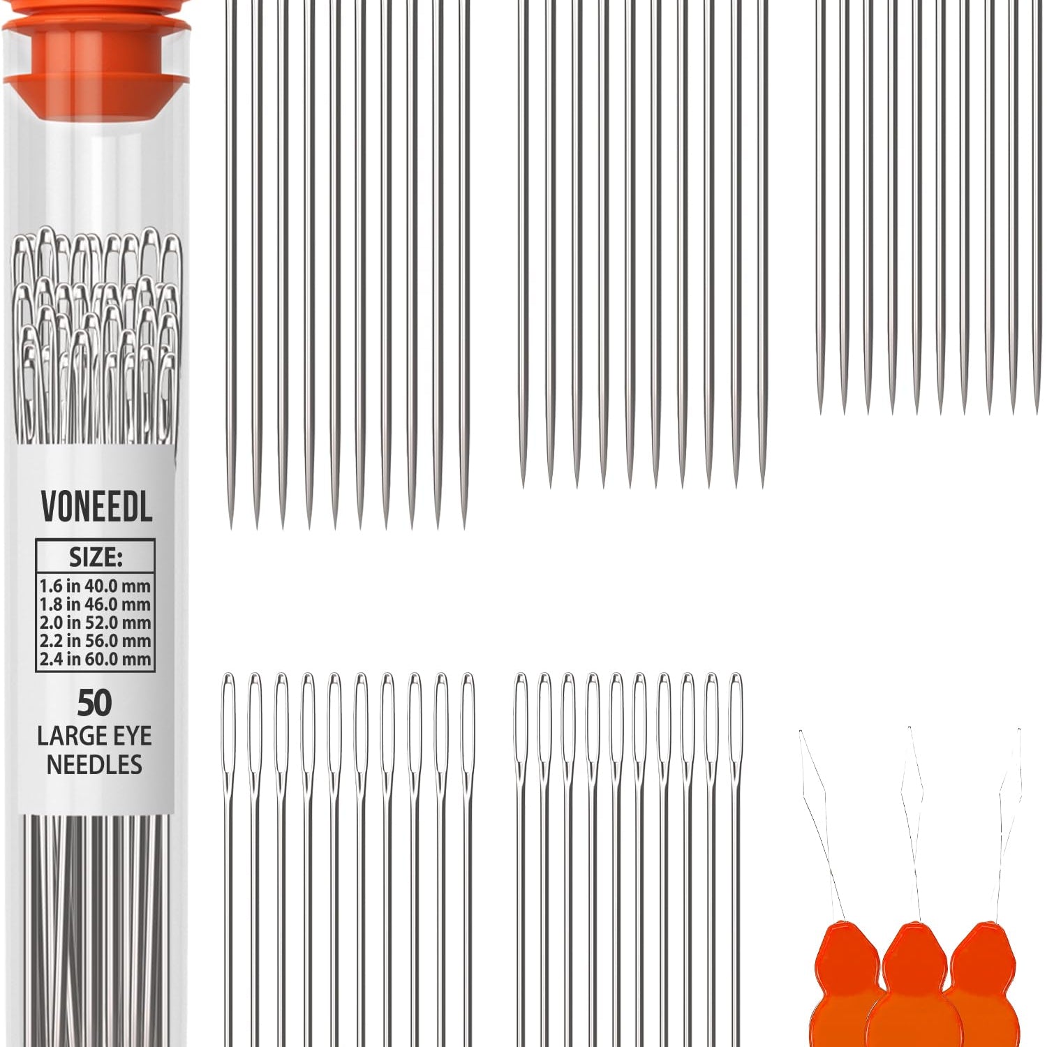 VONEEDL 50 Large Eye Heavy Duty Needles - 5 Sizes Easy to Thread Sharp Point Needles Perfect for Hand Sewing, Knitting, Crewel Darning, Crafting, and DIY