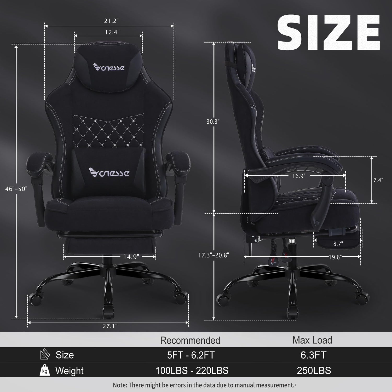 Vonesse Gaming Chair, Computer Chair Fabric with Pocket Spring Cushion, Office Chair with Footrest and Massage Lumbar Support, Reclining Gaming Chairs for Adults 250LBS (Black)