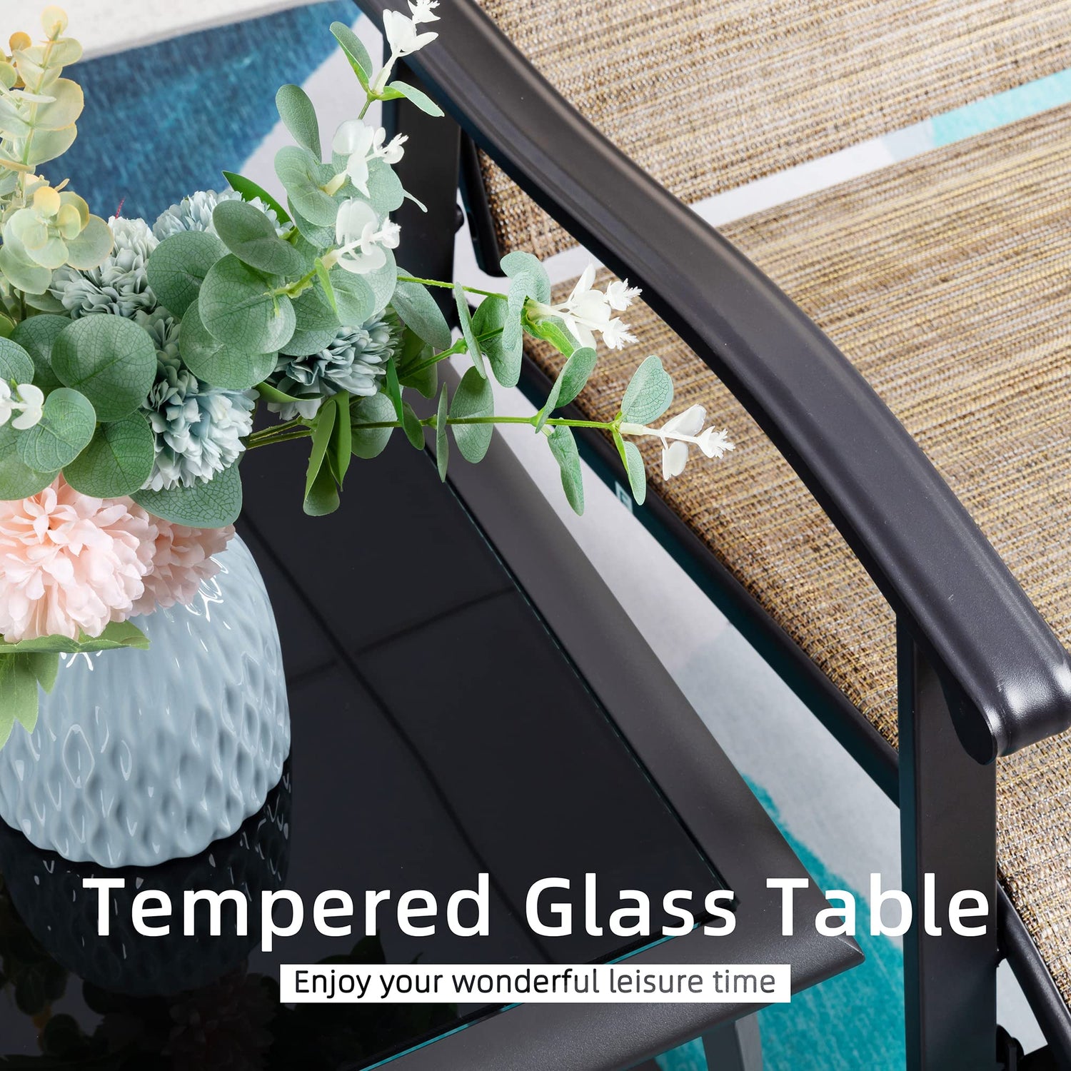 - Sturdy and Durable Construction: Made of heavy-duty steel frame with powder-coated treatment to combat water, UV rays, and rust. The table is made of tempered glass, which is vandal-resistant and heat-resistant.