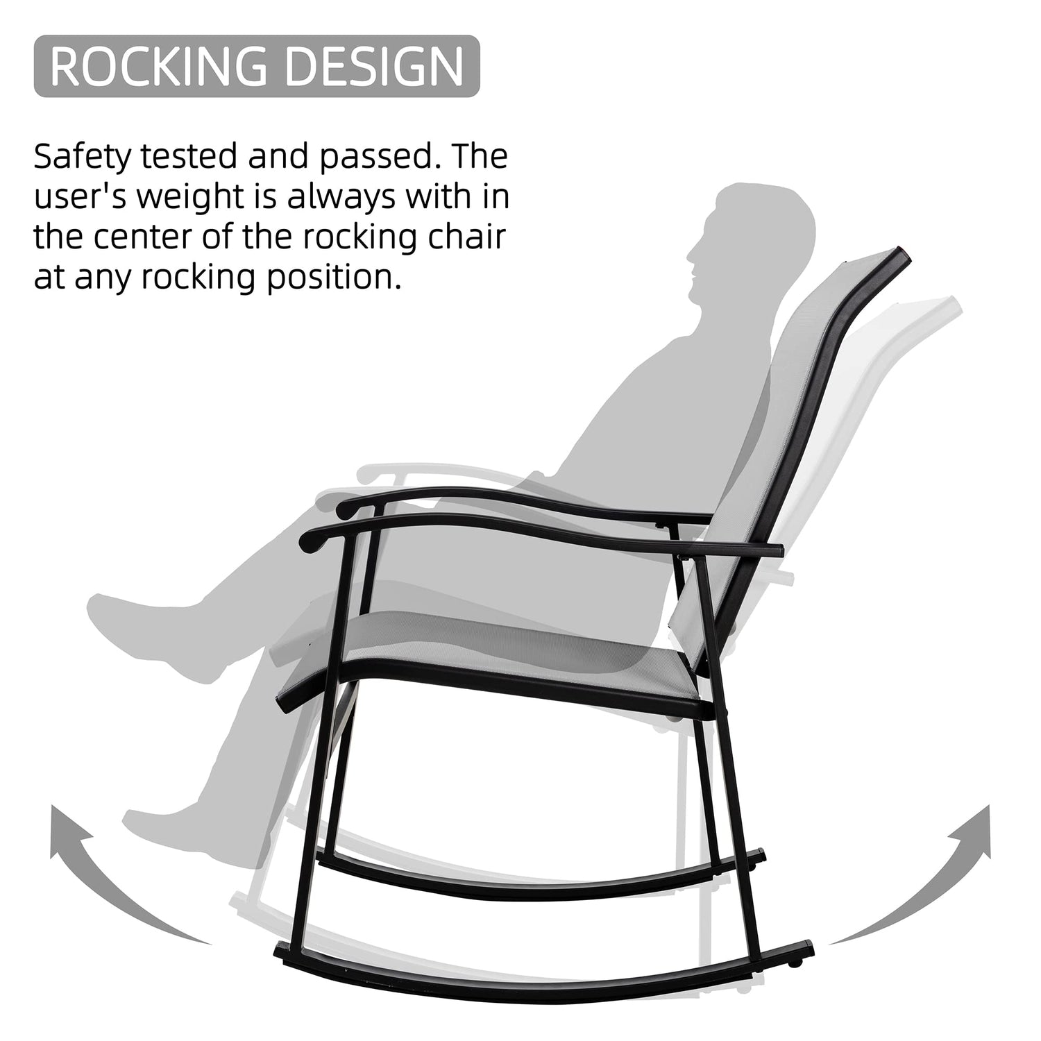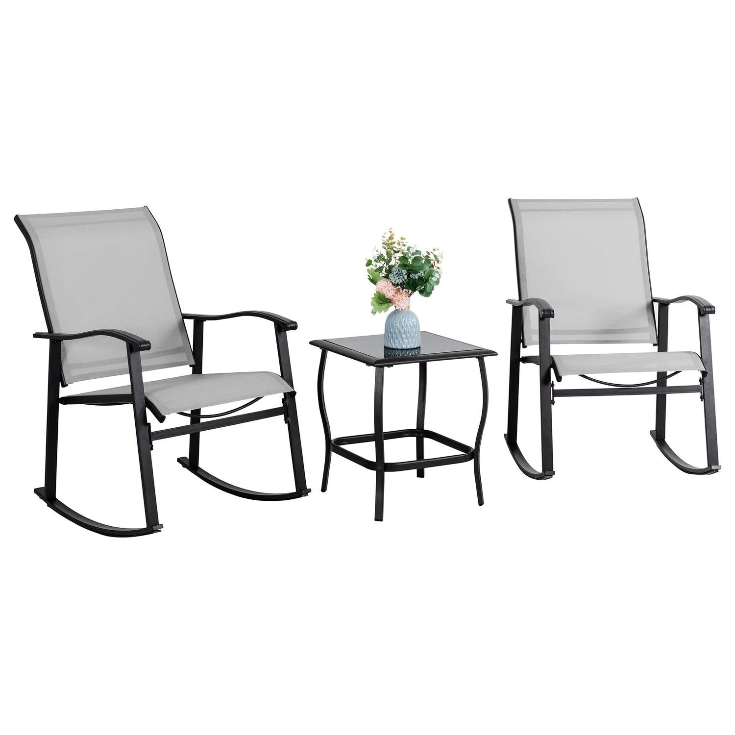 Vongrasig 3 Piece Outdoor Rocking Bistro Set, Textilene Fabric Small Patio Furniture Set, Front Porch Rocker Chairs Conversation Set with Glass Table for Lawn, Garden, Balcony, Poolside (Light Gray)