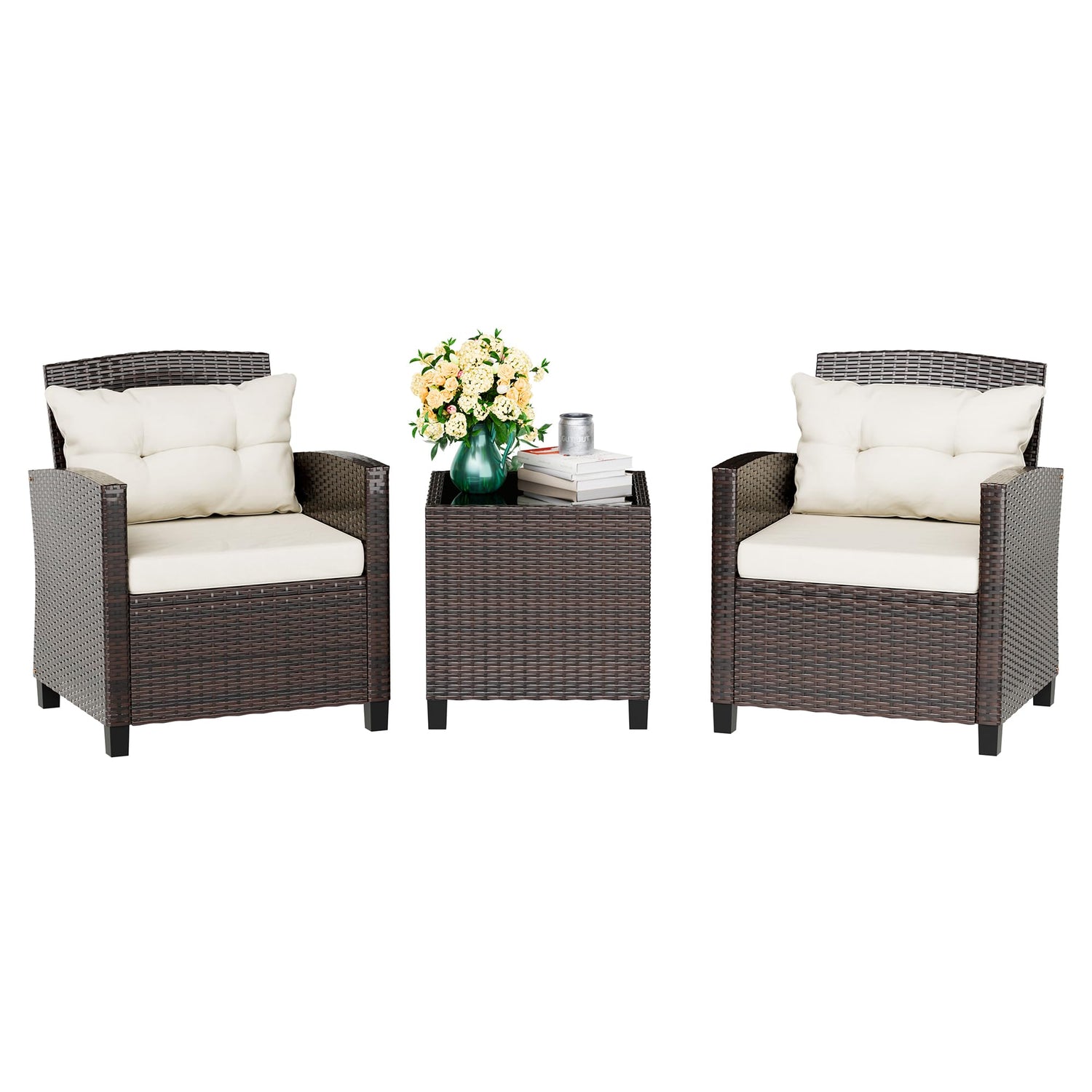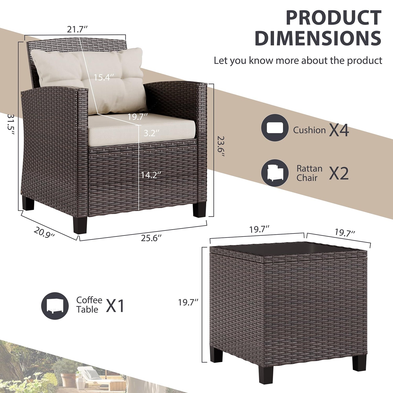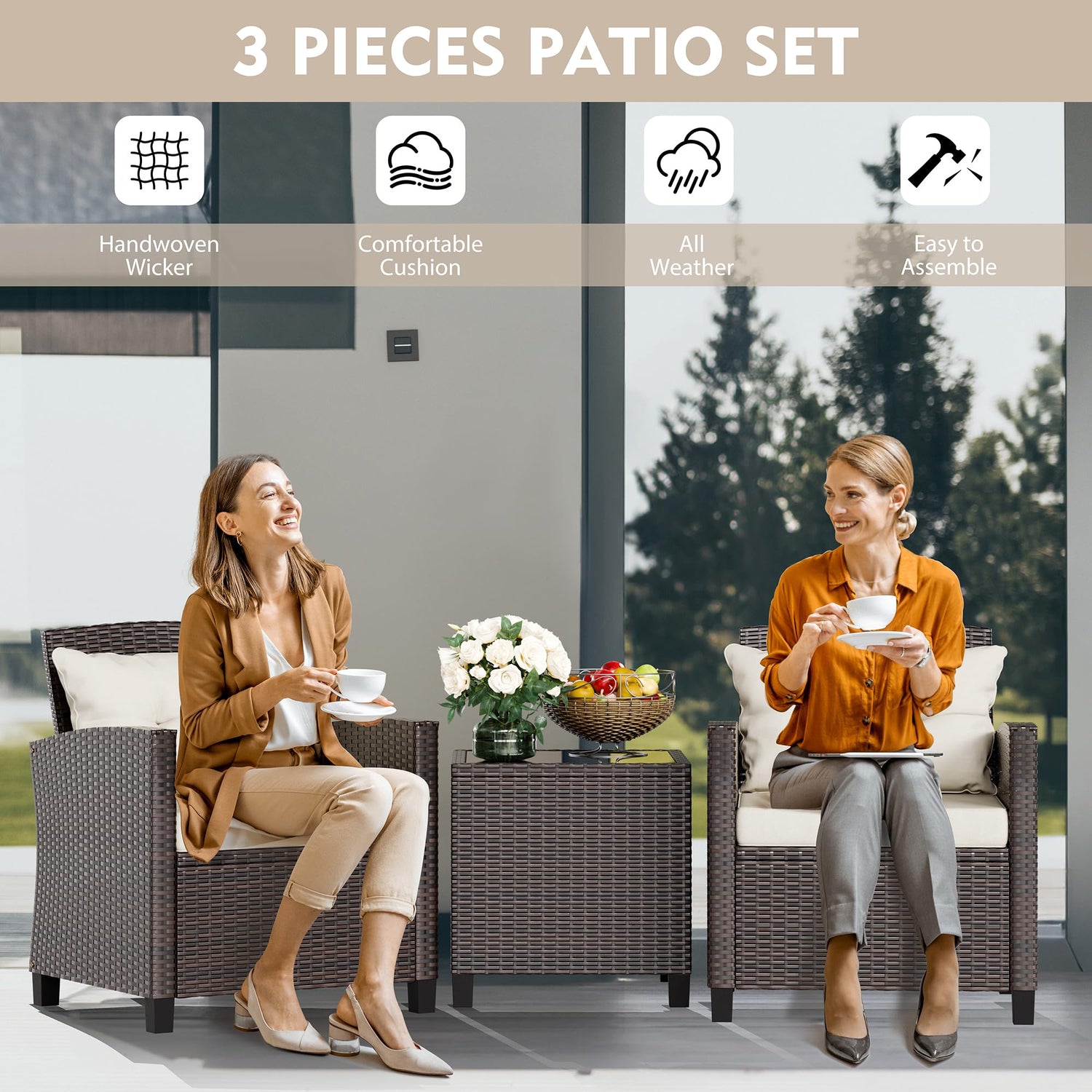 Vongrasig 3 Piece Patio Furniture Set Small Outdoor Wicker Rattan Front Porch Bistro Set Cushioned Patio Chairs Conversation Set with Glass Table for Lawn, Garden, Backyard, Balcony, Poolside (Beige)