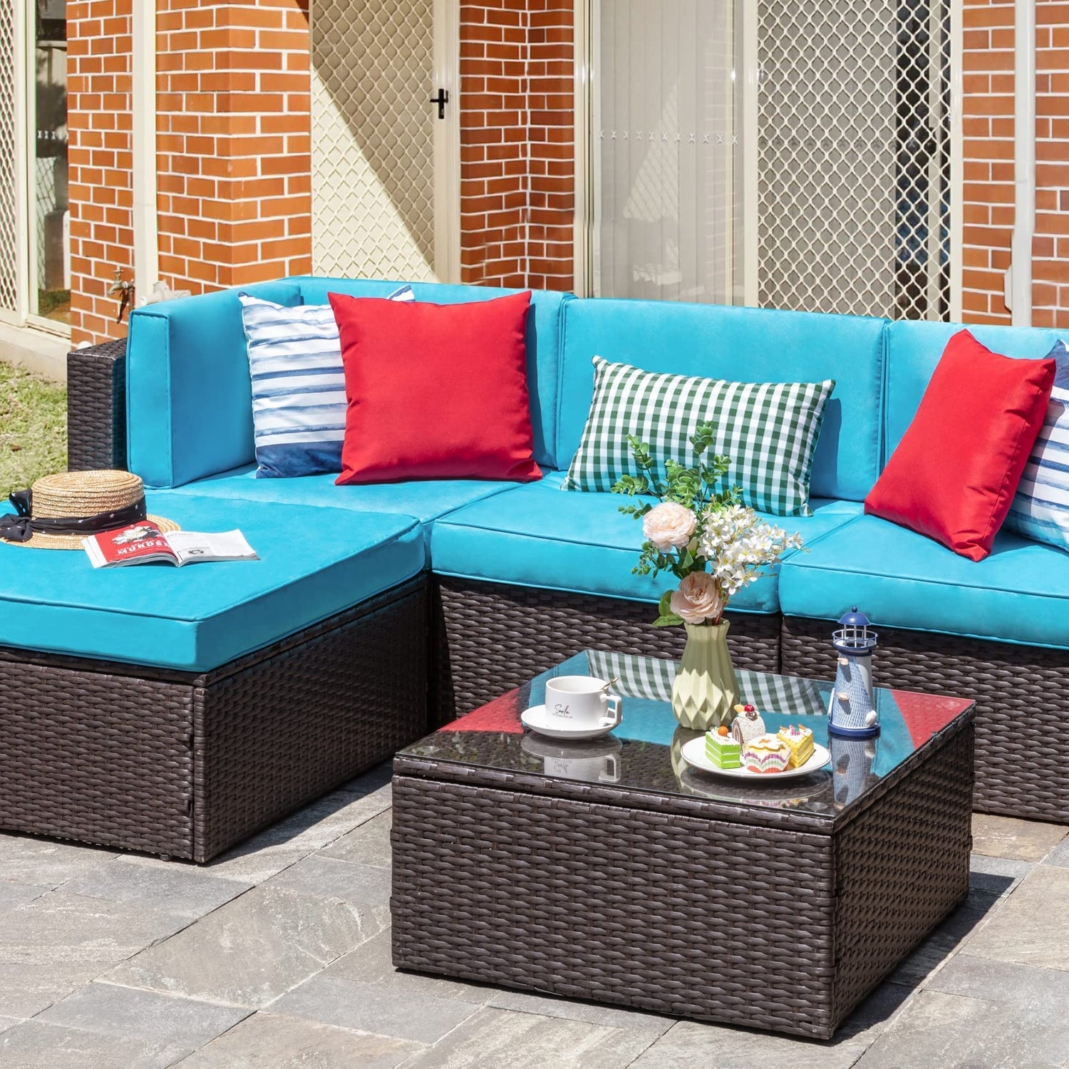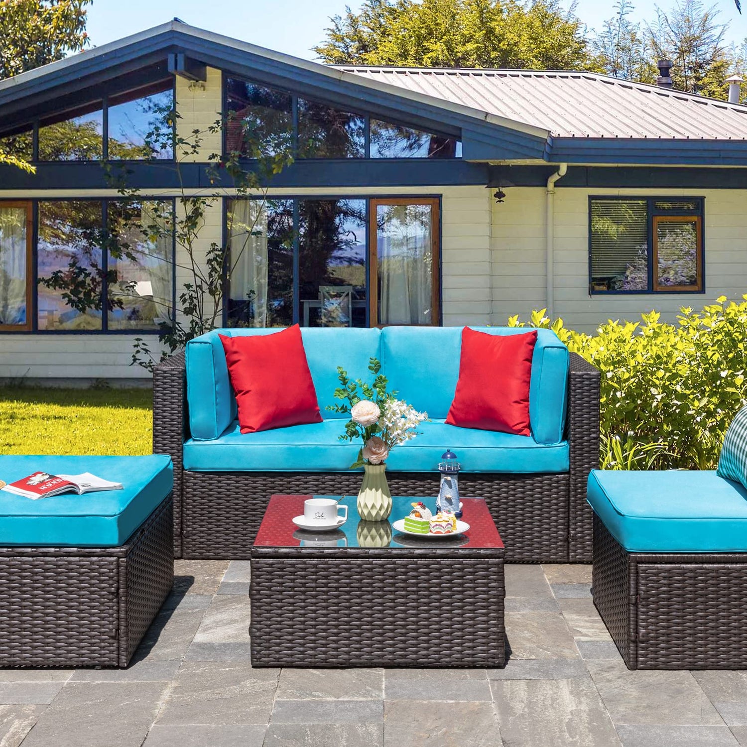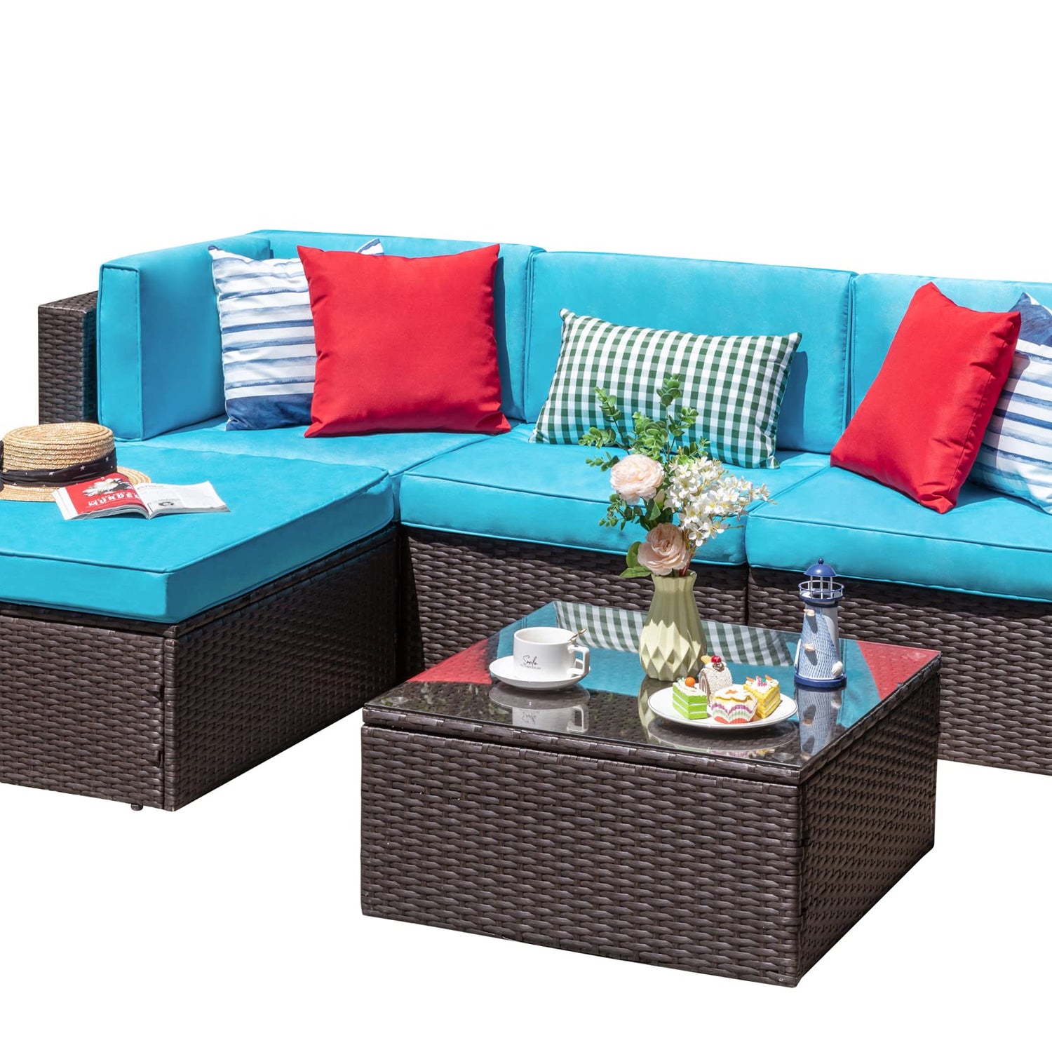 Vongrasig 5 Piece Furniture Sets, All-Weather Brown PE Wicker Outdoor Couch Sectional Small Patio Conversation Garden Sofa Set w/Ottoman, Glass Table, Blue