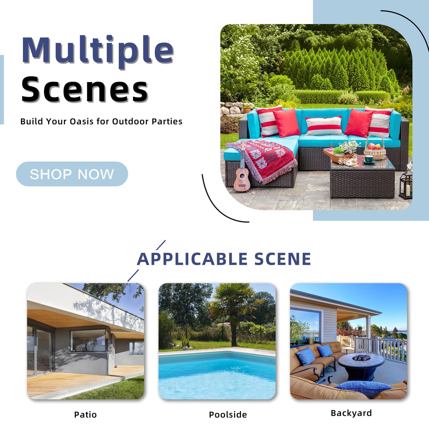 - Convertible Patio Set: Each part of this 5- piece patio furniture could be used separately, easily allowing to be combined into different configurations according to your needs. Ottoman also can be an extra seating or part of a chaise lounge; Ideal for outdoor patio, porch, backyard, balcony, garden and poolside.