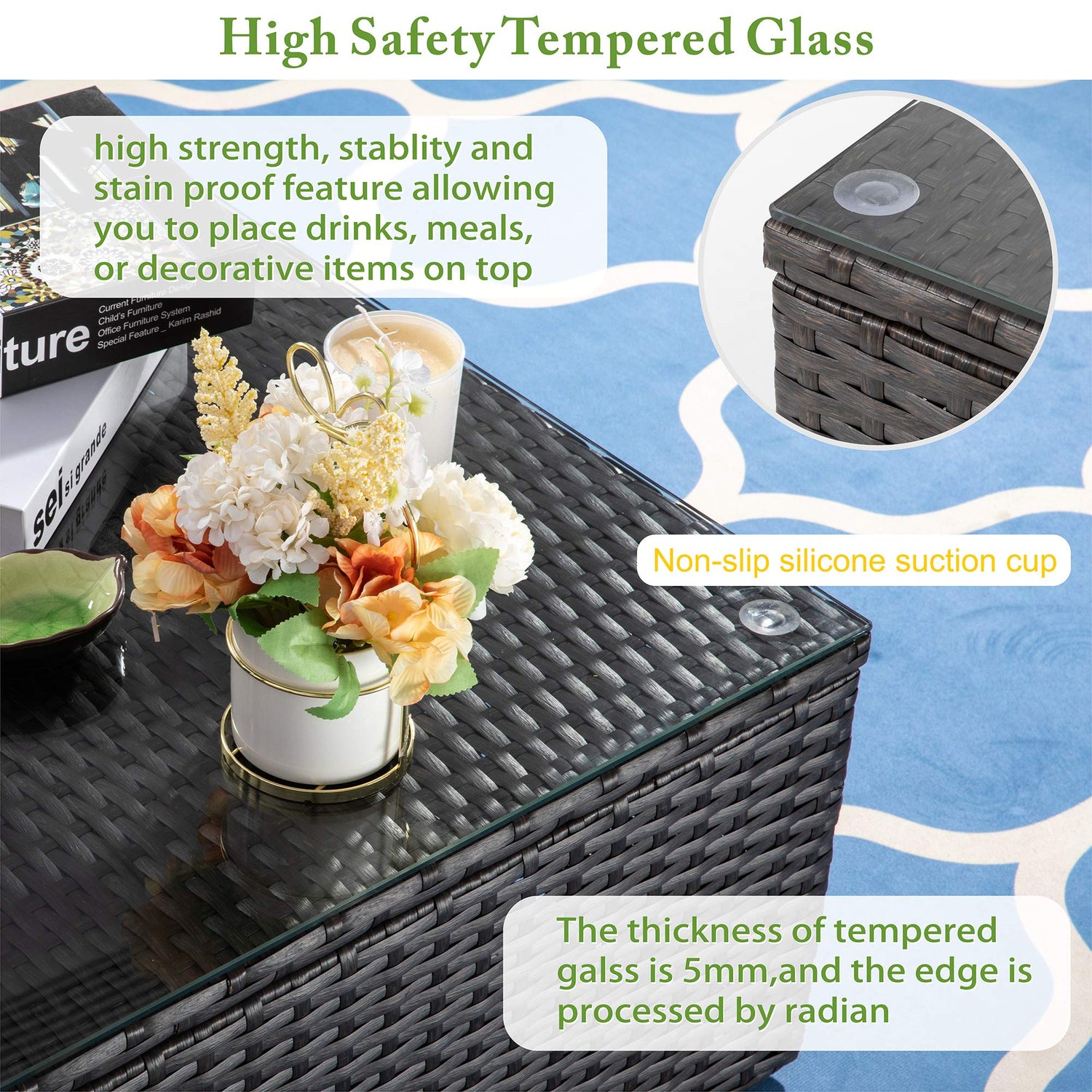 - Easy Cleaning and Maintain: Our patio conversation set features a water proof wicker and removable tempered glass top for the coffee table, easy for wipe cleaning; zippered cushion covers are made of superior fabric, fade resistant, water spill repellent and washable.