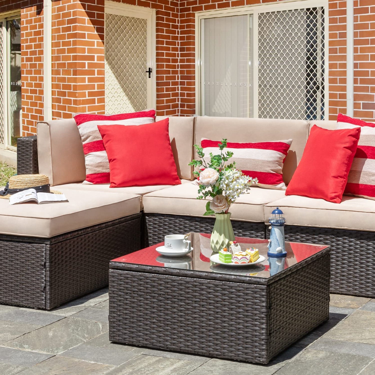 Vongrasig 5 Piece Patio Furniture Sets, All-Weather Brown PE Wicker Outdoor Couch Sectional Set, Small Conversation Set for Garden/Patio w/Ottoman, Glass Table, Red Pillow, Beige