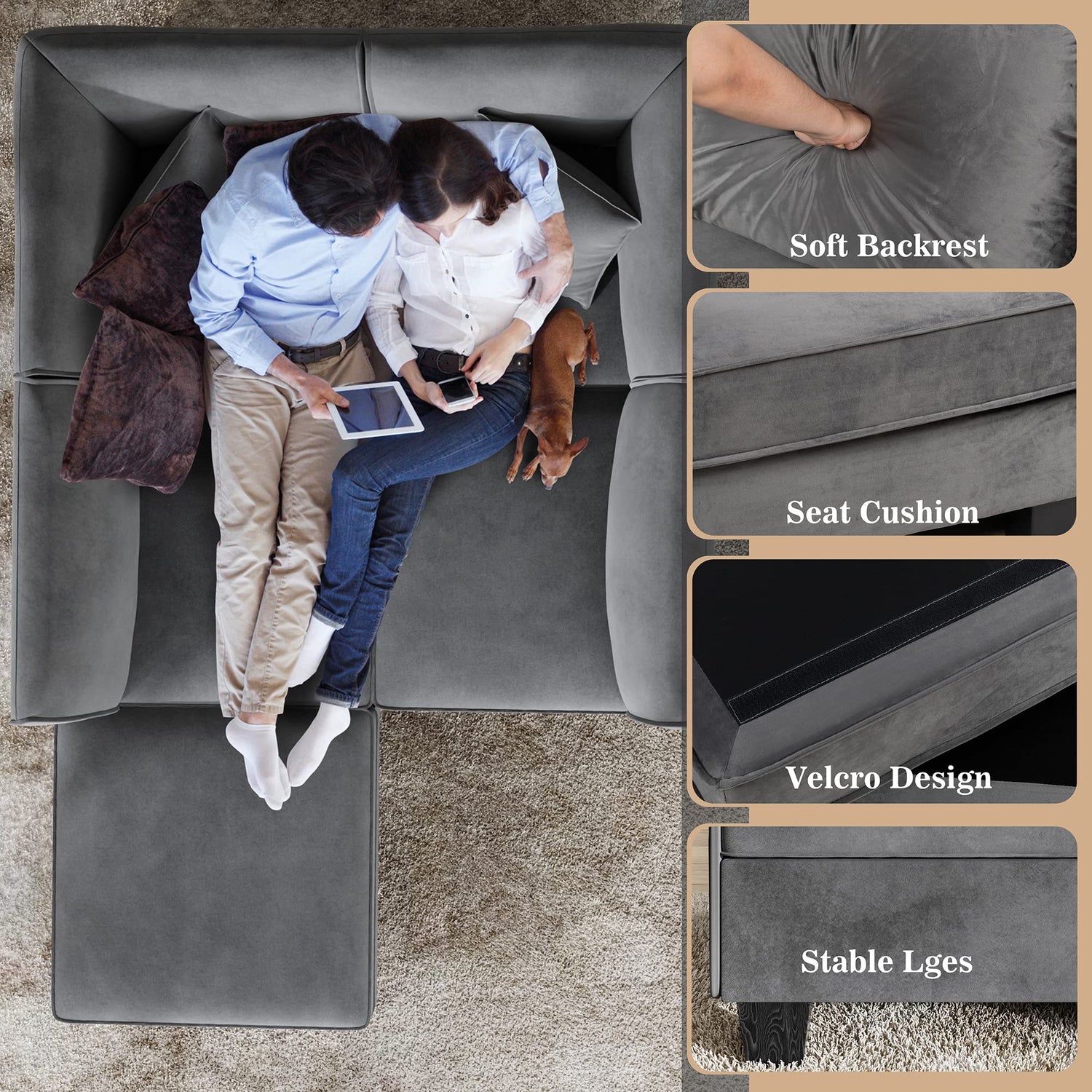 Vongrasig 5 Pieces Sectional Couch Modular Sofa with Reversible Chaise 116" Velvet L-Shaped Couch Sofa 4-seat Modular Large Sectional Couch with Ottoman for Living Room, Upholstered Cushion (Grey)
