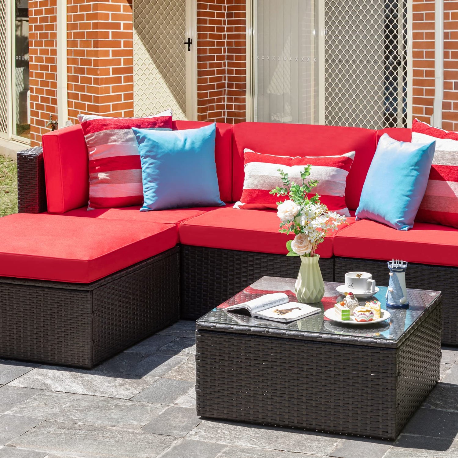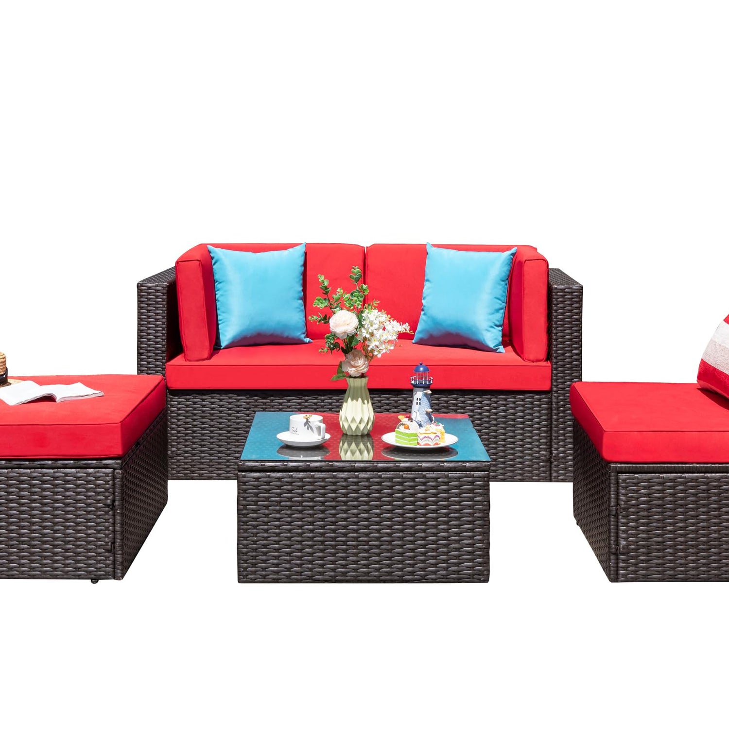 Vongrasig 5 Pieces Small Patio Furniture Sets, All-Weather Outdoor Sectional Patio Sofa Wicker Rattan Patio Seating Sofas with Cushion and Glass Table (Red)