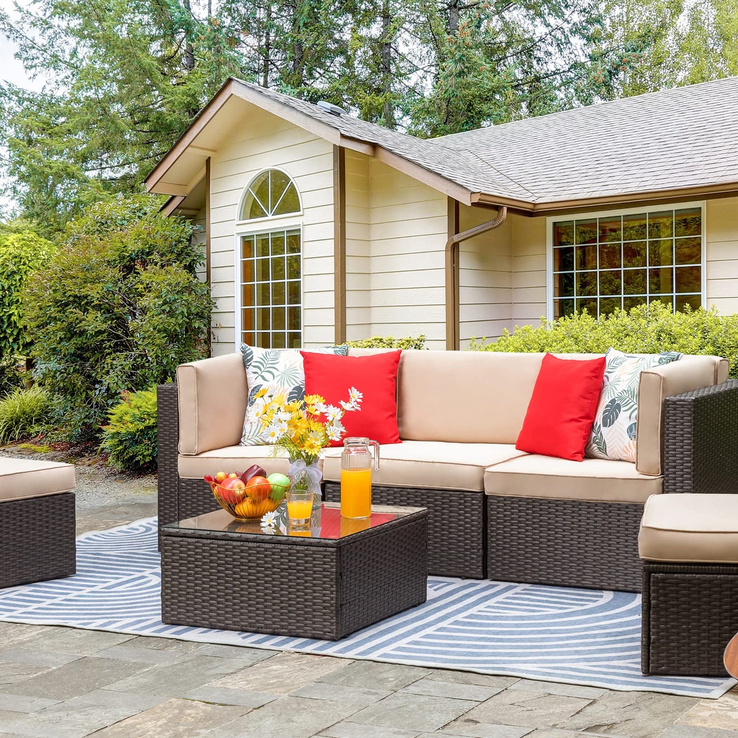 Vongrasig 6 Piece Small Patio Furniture Sets, All Weather PE Wicker Rattan Outdoor Sectional Sofa Conversation Couch with Glass Table, Cushions and Red Pillows, for Lawn, Garden, Backyard (Beige)