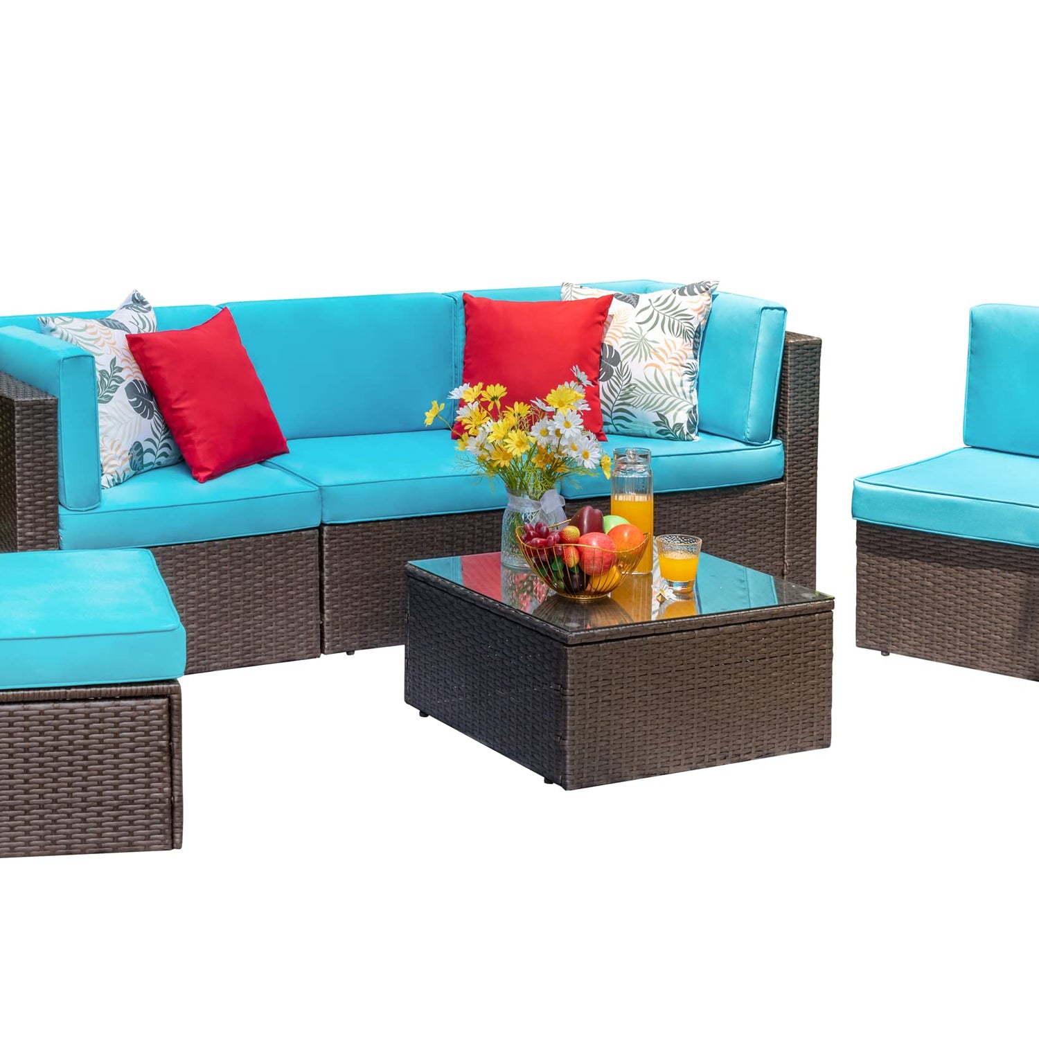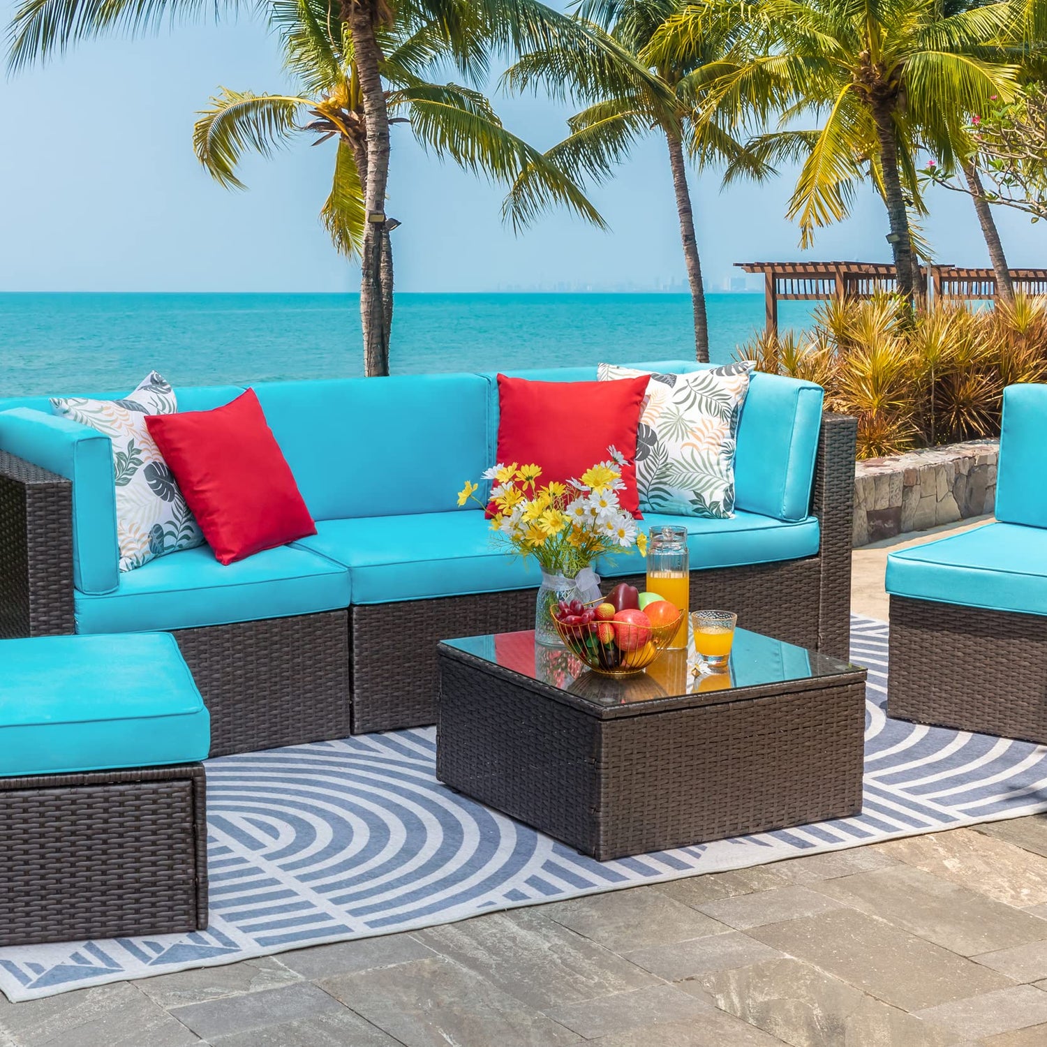 Vongrasig 6 Piece Small Patio Furniture Sets, Outdoor Sectional Sofa All Weather PE Wicker Patio Sofa Couch Garden Backyard Conversation Set with Glass Table,Blue Cushions and Red Pillows (Blue)