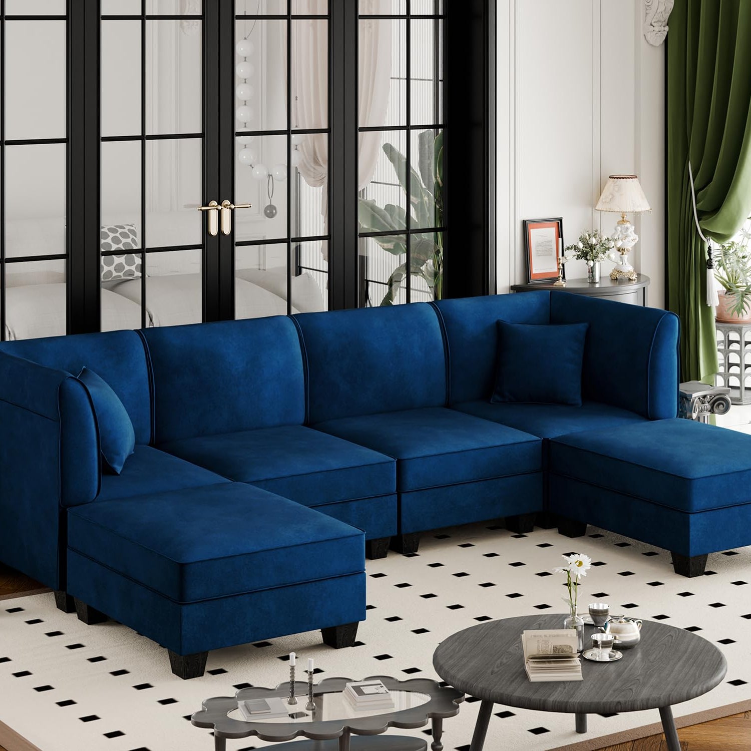 Vongrasig 6 Pieces Sectional Couch Modular Sofa with Reversible Chaise Velvet U-Shaped Couch Sofa 6-seat Modular Large Sectional Couch with Ottoman for Living Room, Upholstered Cushion (Dark Blue)