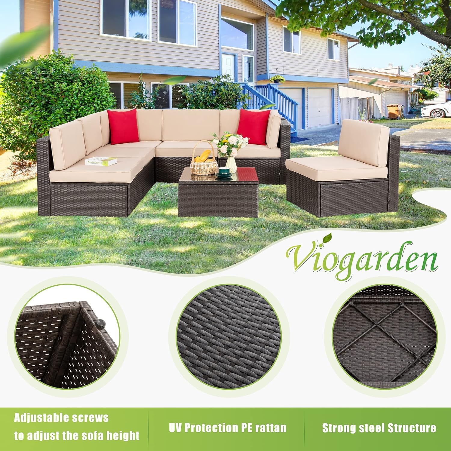 Vongrasig 7 Pieces Patio Furniture Sets, Outdoor All-Weather Wicker Patio Conversation Sets, L-Shaped Rattan Sectional Patio Sofa with Glass Table for Backyard, Beige