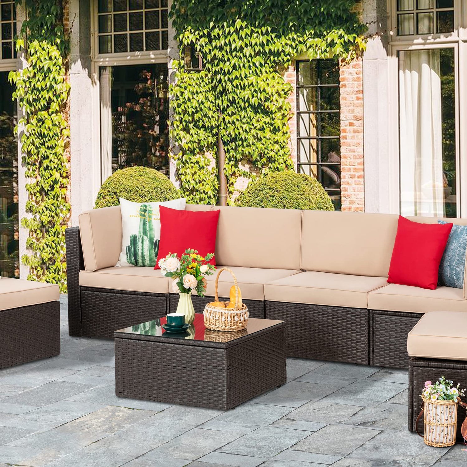 Vongrasig 7 Pieces Patio Furniture Sets, Outdoor Patio Conversation Set PE Rattan Wicker Sectional Sofa Couch with Glass Coffee Table for Garden, Poolside, Backyard, Beige