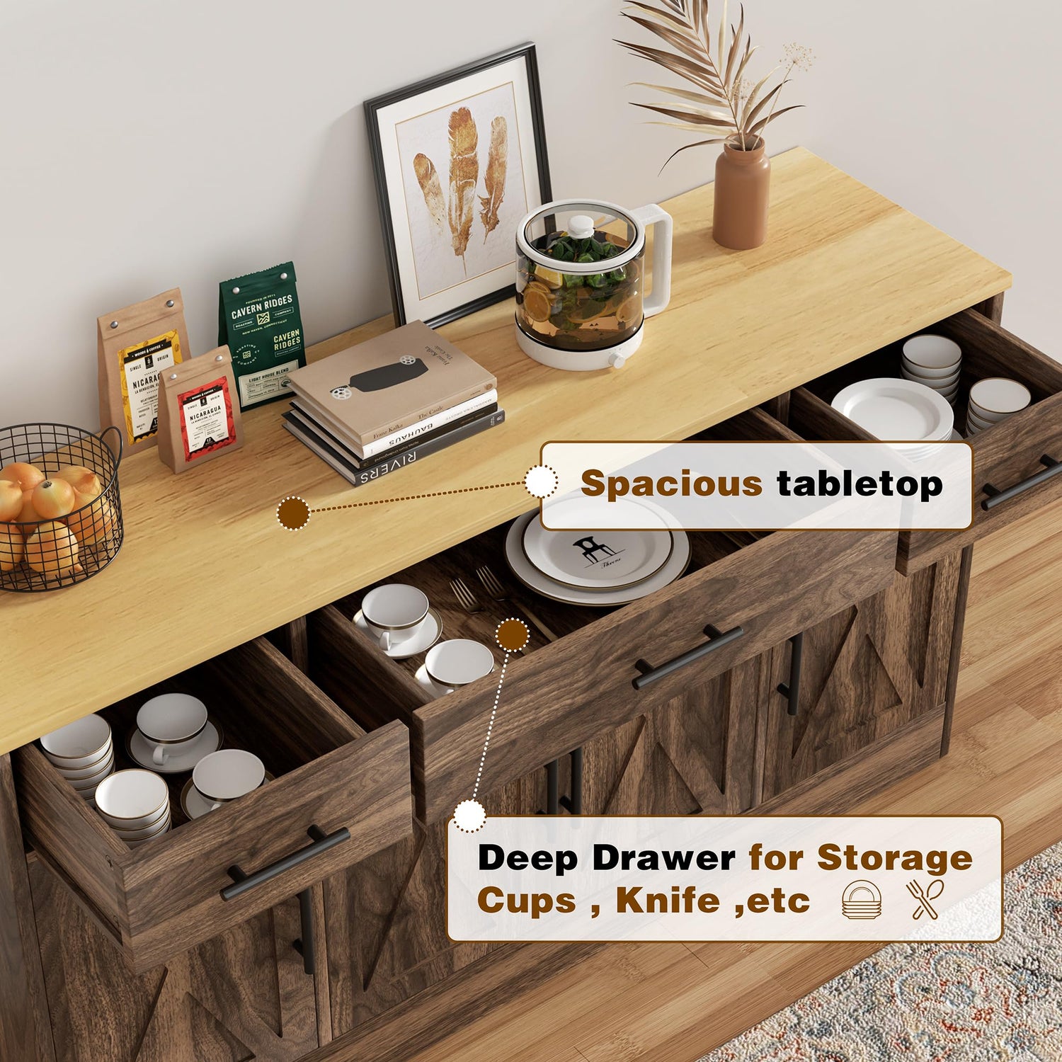 Vongrasig Buffet Cabinet with Drawers, 53” Large Sideboard Buffet Kitchen Storage Cabinet, Modern Farmhouse Coffee Bar with Shelves and Doors, Wood Buffet Table for Kitchen, Dining Room, Rustic Brown