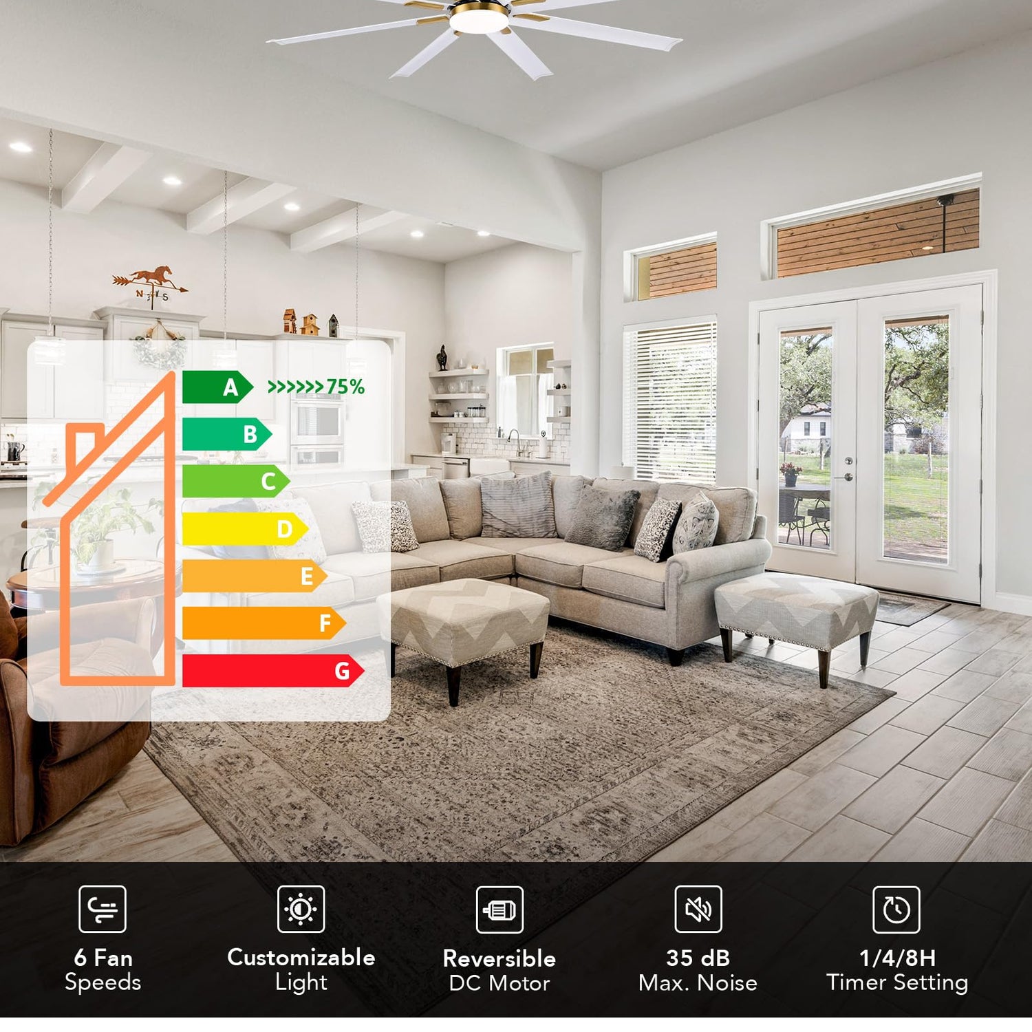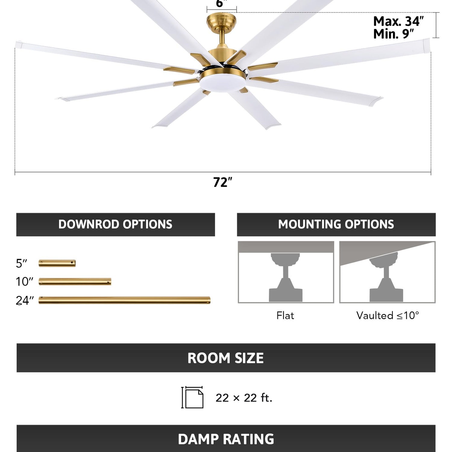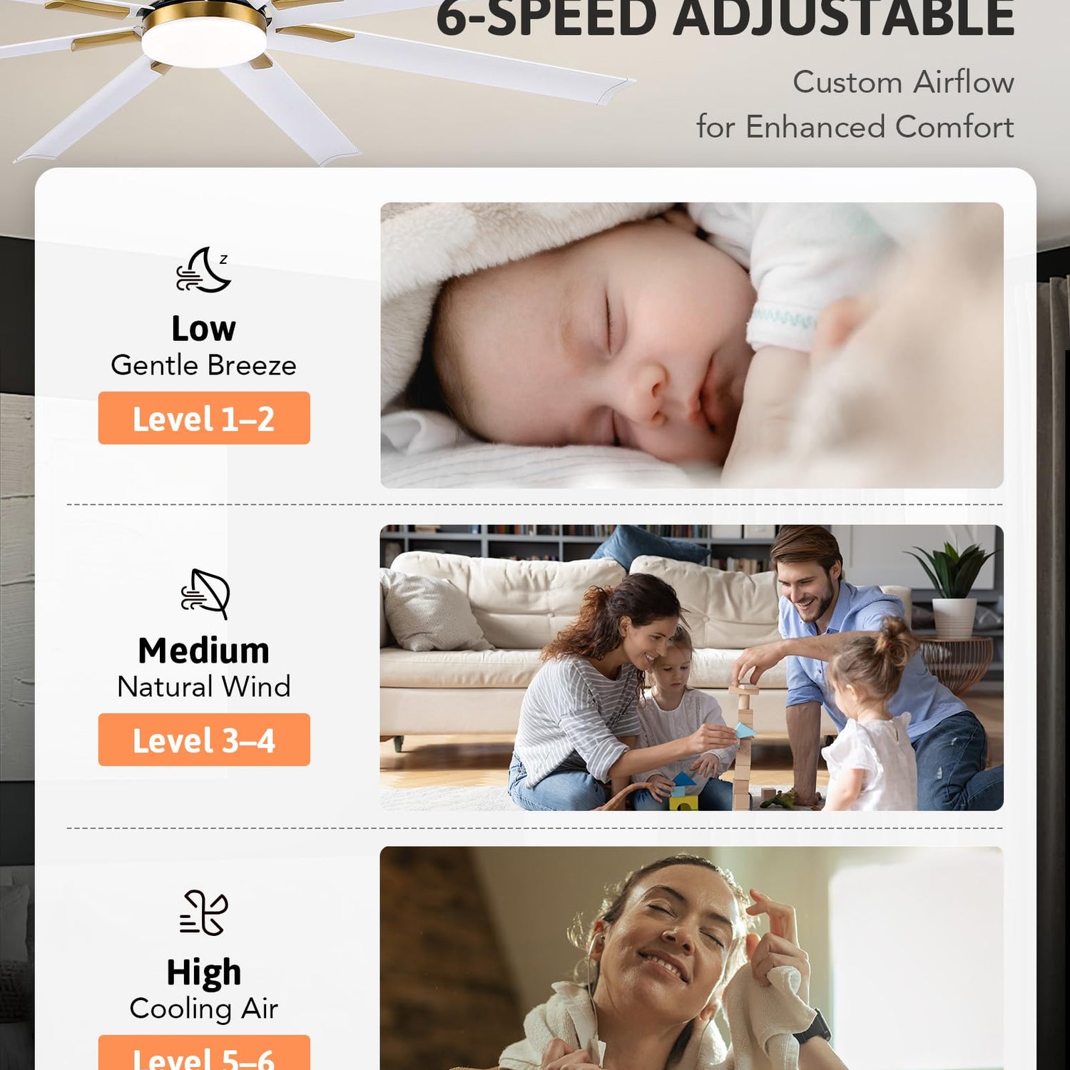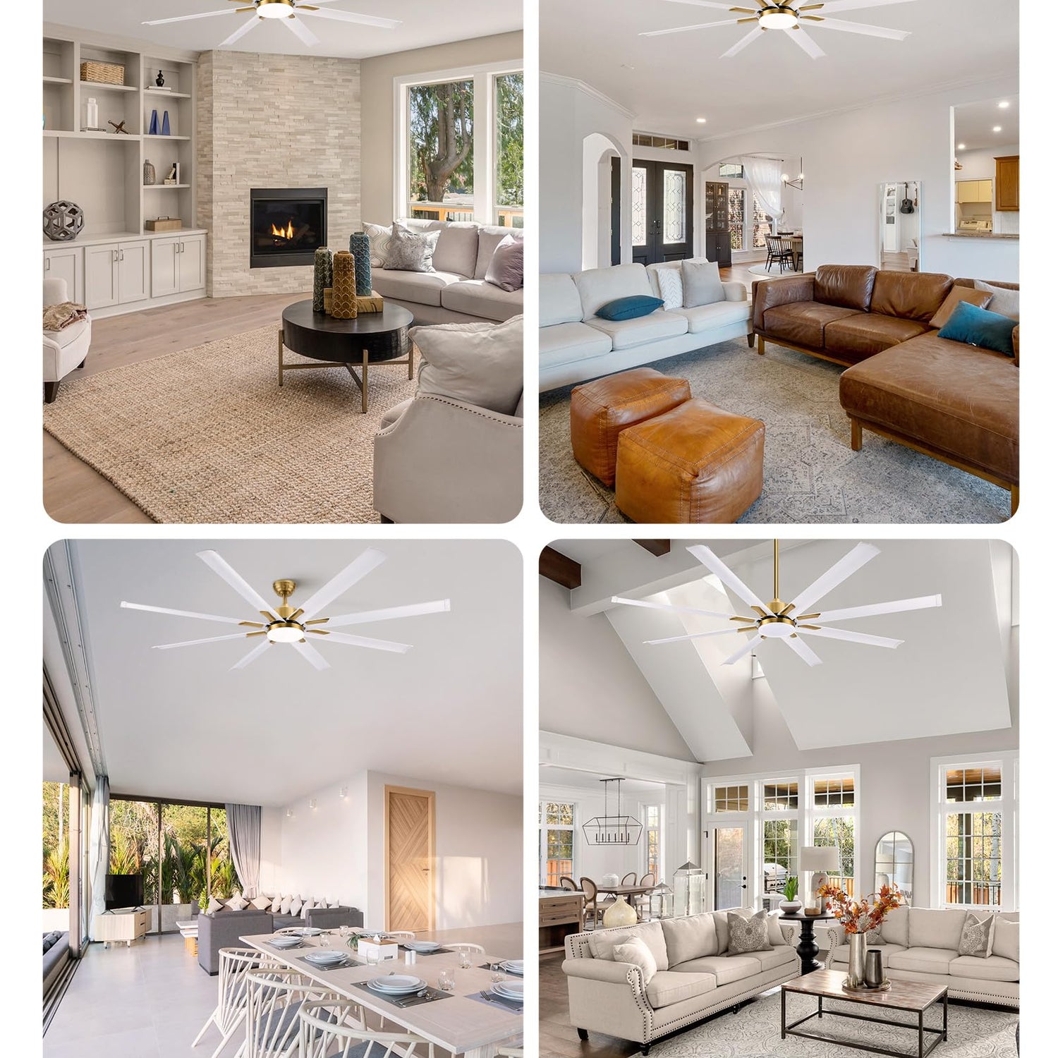 VONLUCE 72 Inch Ceiling Fans with Lights, Large Industrial Ceiling Fan and Remote, 8 Aluminum Blades, 6 Speeds Quiet Reversible DC Motor, Metal Ceiling Fan for Farmhouse Living Room Office, White Gold