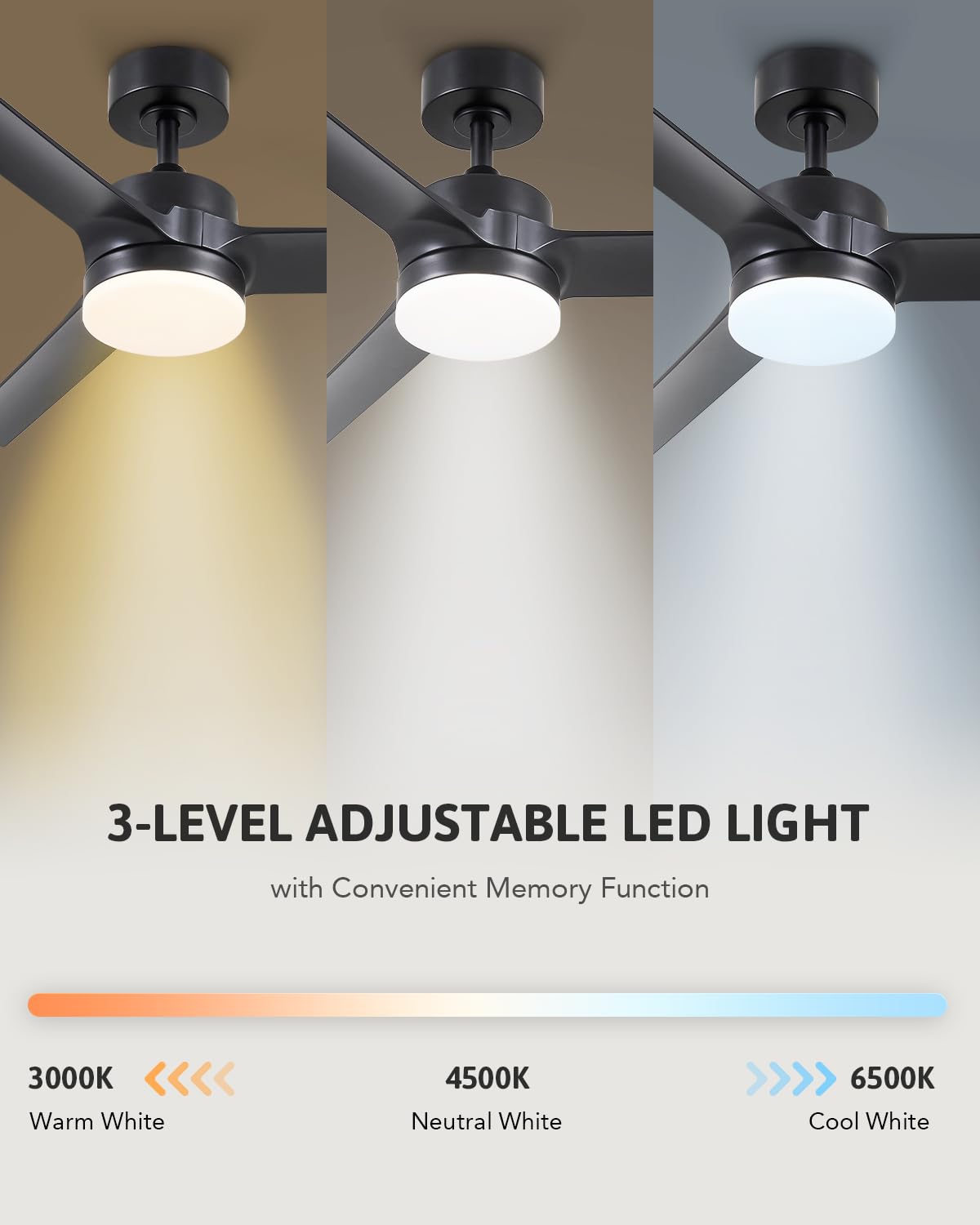 - Adjustable Color Temperatures: Our 52 inch ceiling fans let you choose between 3000K, 4500K, and 6500K light settings, allowing you to effortlessly set the right mood for any occasion