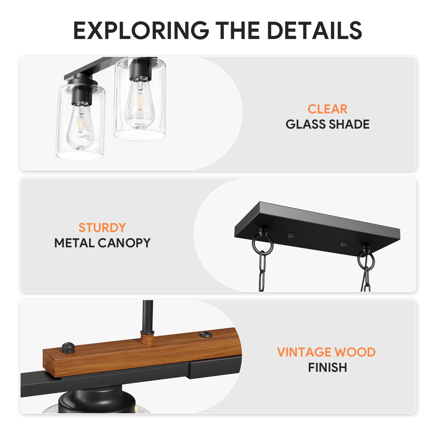 - Illuminate in Style: Bathe your kitchen in warm welcoming illumination with Vonluce's pendant light. The elegant combination of sleek black accents, wood color finish, and clear glass shades brings a touch of rustic charm and modern sophistication to your space