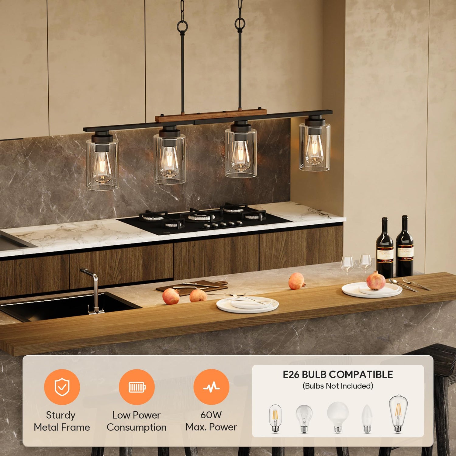 - Inviting Ambiance: This 4-light farmhouse linear chandelier welcomes E26 bulbs up to 60W, providing bright, soft, and comfortable lighting to create a warm and inviting dining atmosphere