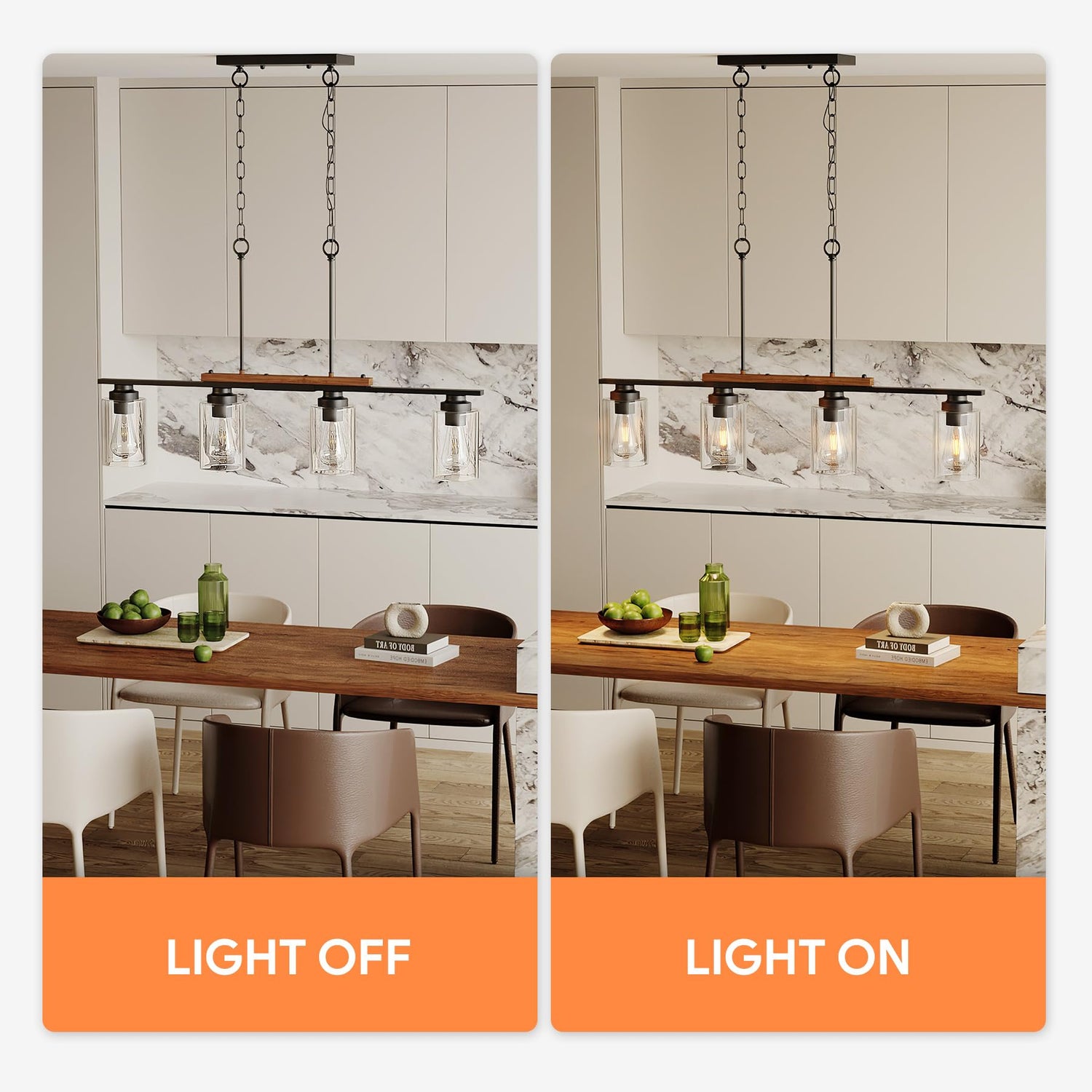 - Height Adjustable: Easily adjust the height of this kitchen island light fixture from 21" to 58" with convenient downrods and chains, ensuring a perfect fit for your kitchen island, dining table, hallway, living room, and more