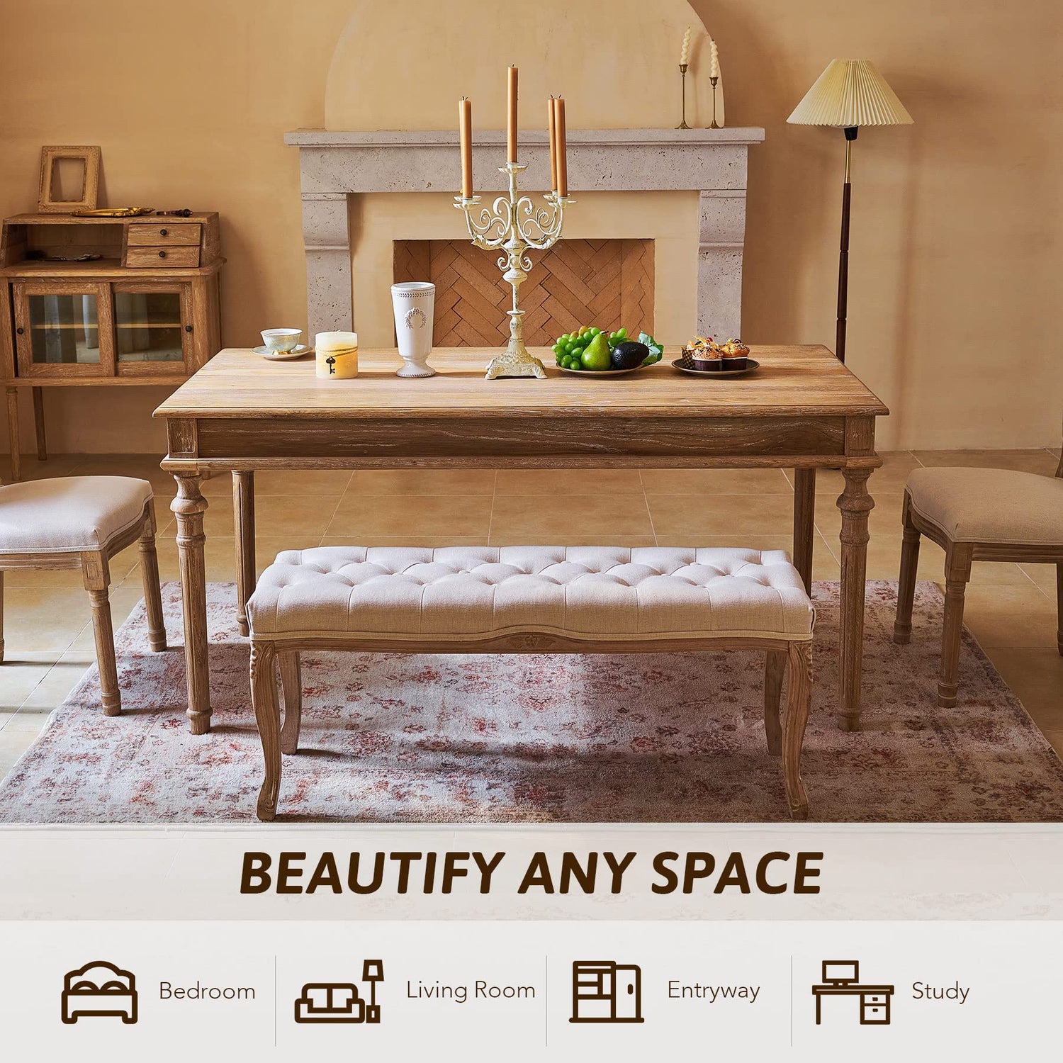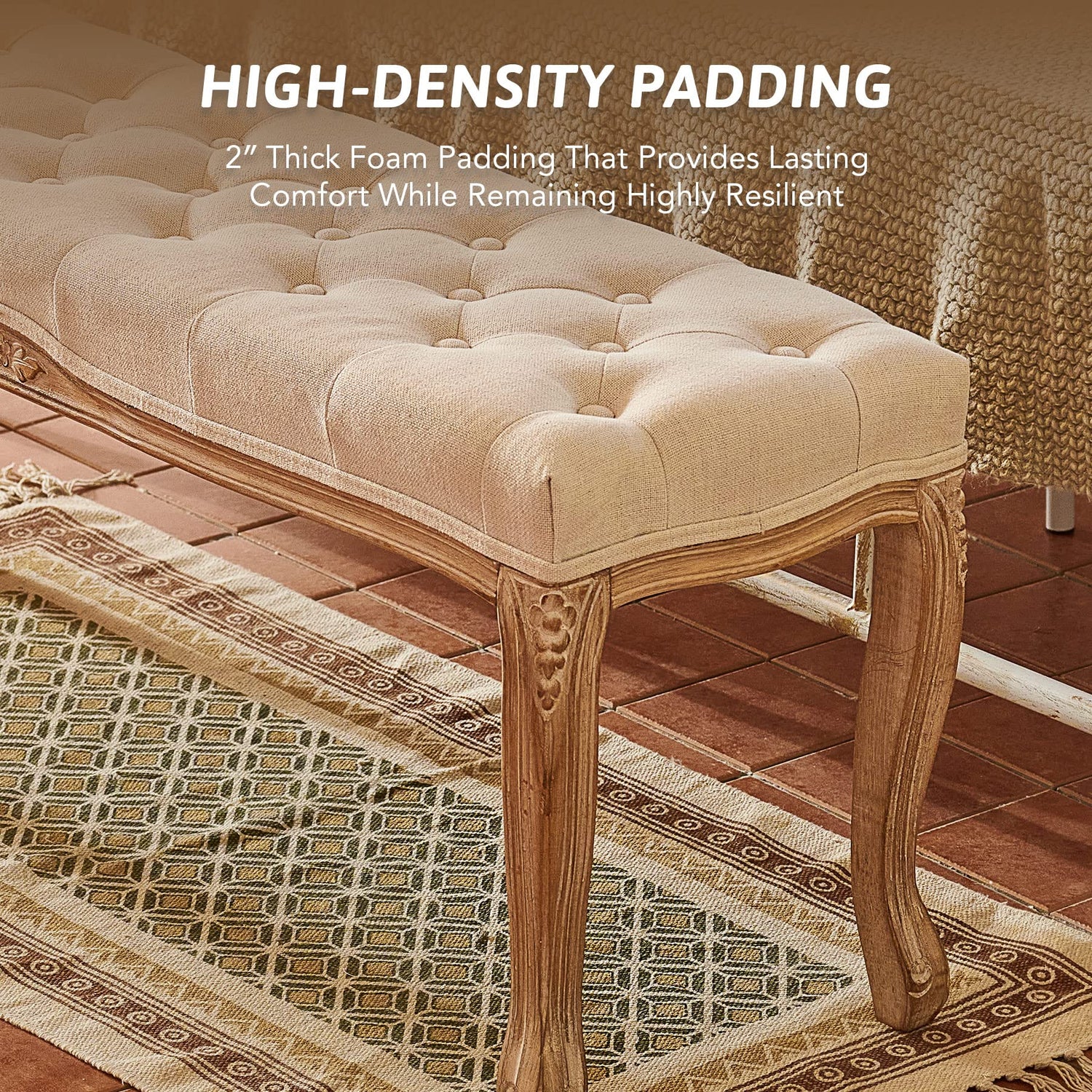 VONLUCE Vintage Bench with Padded Seat & Rubberwood Legs, 44" Memory Foam Upholstered Entryway Bench, Tufted Fabric End of Bed Bench for Bedroom and Living Room, French Style, Beige