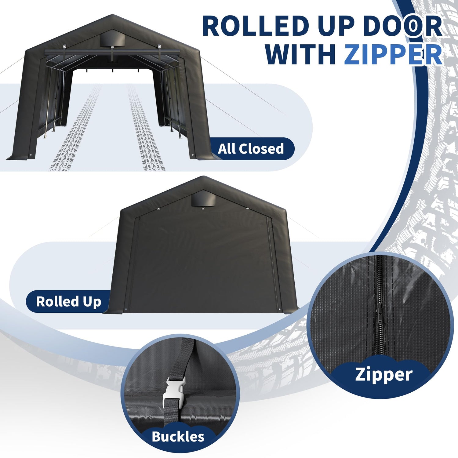 - Thick Fabric:200g polyethylene fabric, shielding from wind, rain and sunlight, the carport can be used in all seasons. There are doors with zippers and buckles can be rolled up,and the doors in front and back of the portable garage make it convenient for your access.