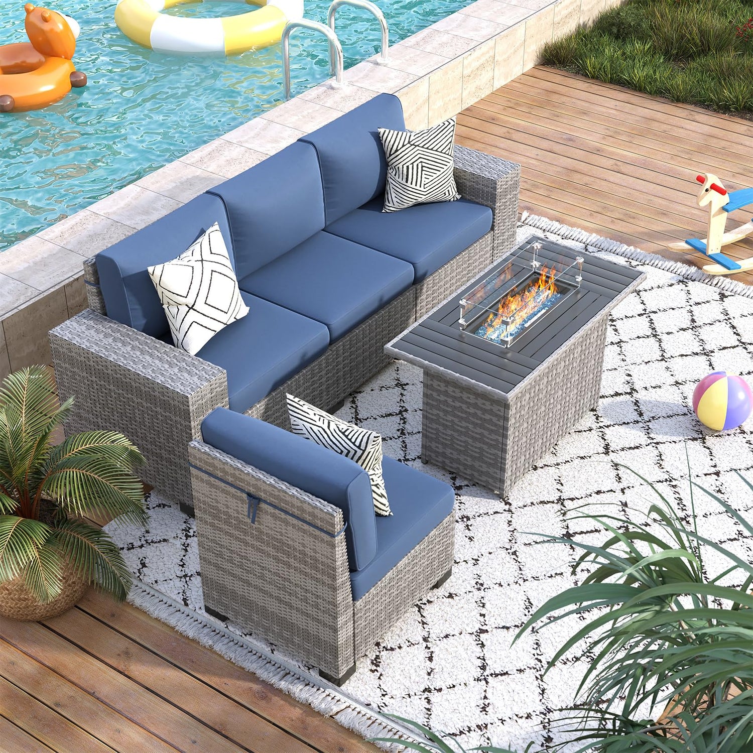 VONZOY 5 Piece Patio Furniture Set with Fire Pit Table, Outdoor Conversation Sets Grey Wicker Rattan Sectional Sofa, 4'' Thickened Cushion Navy Blue (Include Waterproof Cover)
