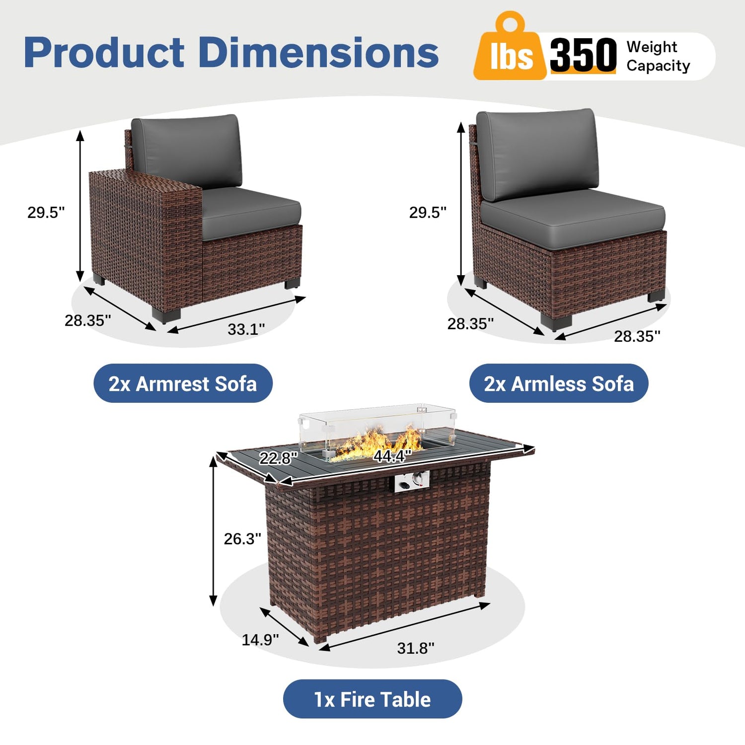 VONZOY 5 Piece Patio Furniture Set with Fire Pit Table, Outdoor Sectional Conversation Sets Brown Wicker Rattan Sectional Sofa for Patio Garden Backyard, 4'' Thickened Cushion Dark Grey