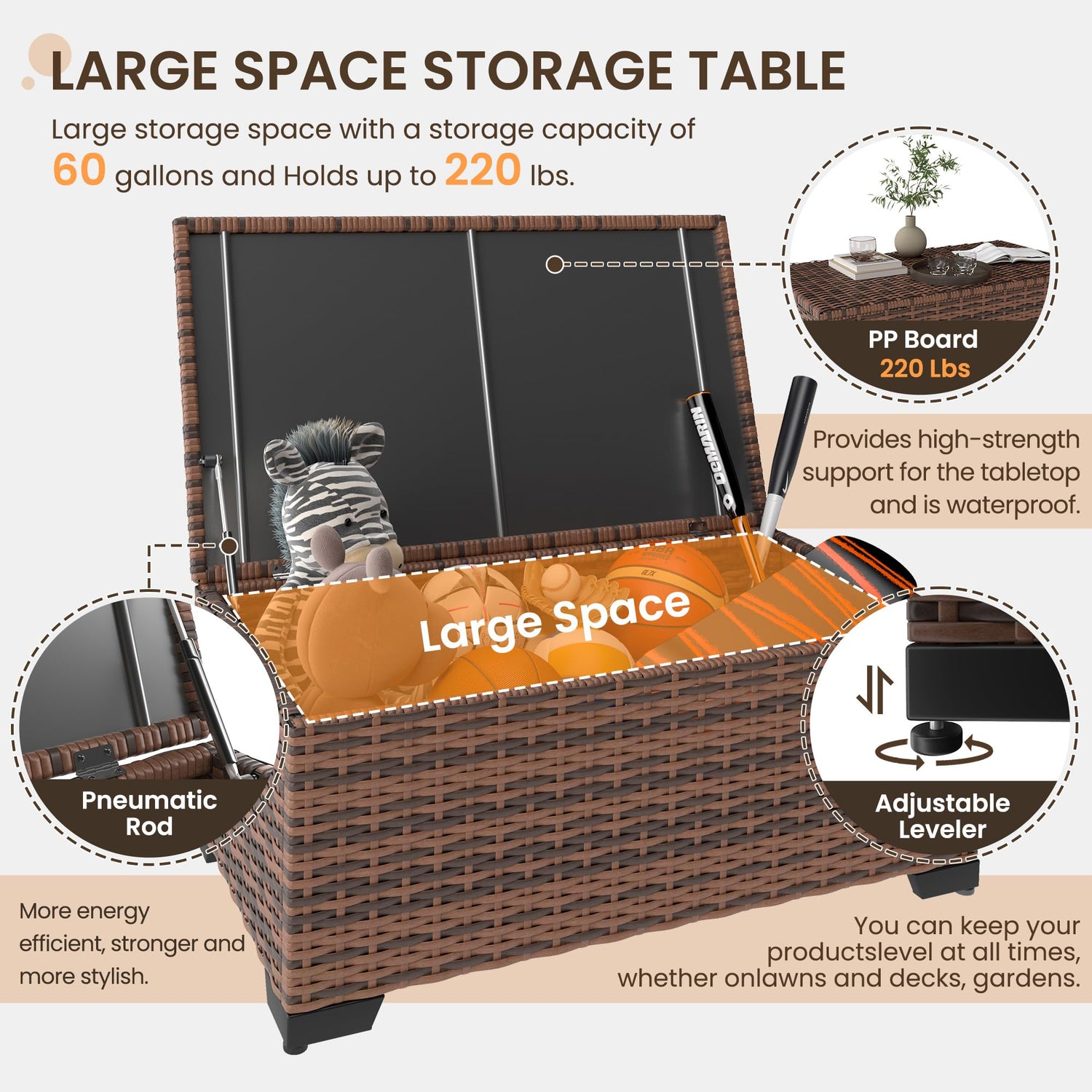 - 【Large Space Coffee Table】-Not only can the patio funiture side table be used coffee table to place eats or coffee, but also be used as a seat. 60 gallons storage space be used indoors or outdoors to store various items. Enjoy your balcony leisure time by modern classic style outdoor furniture.