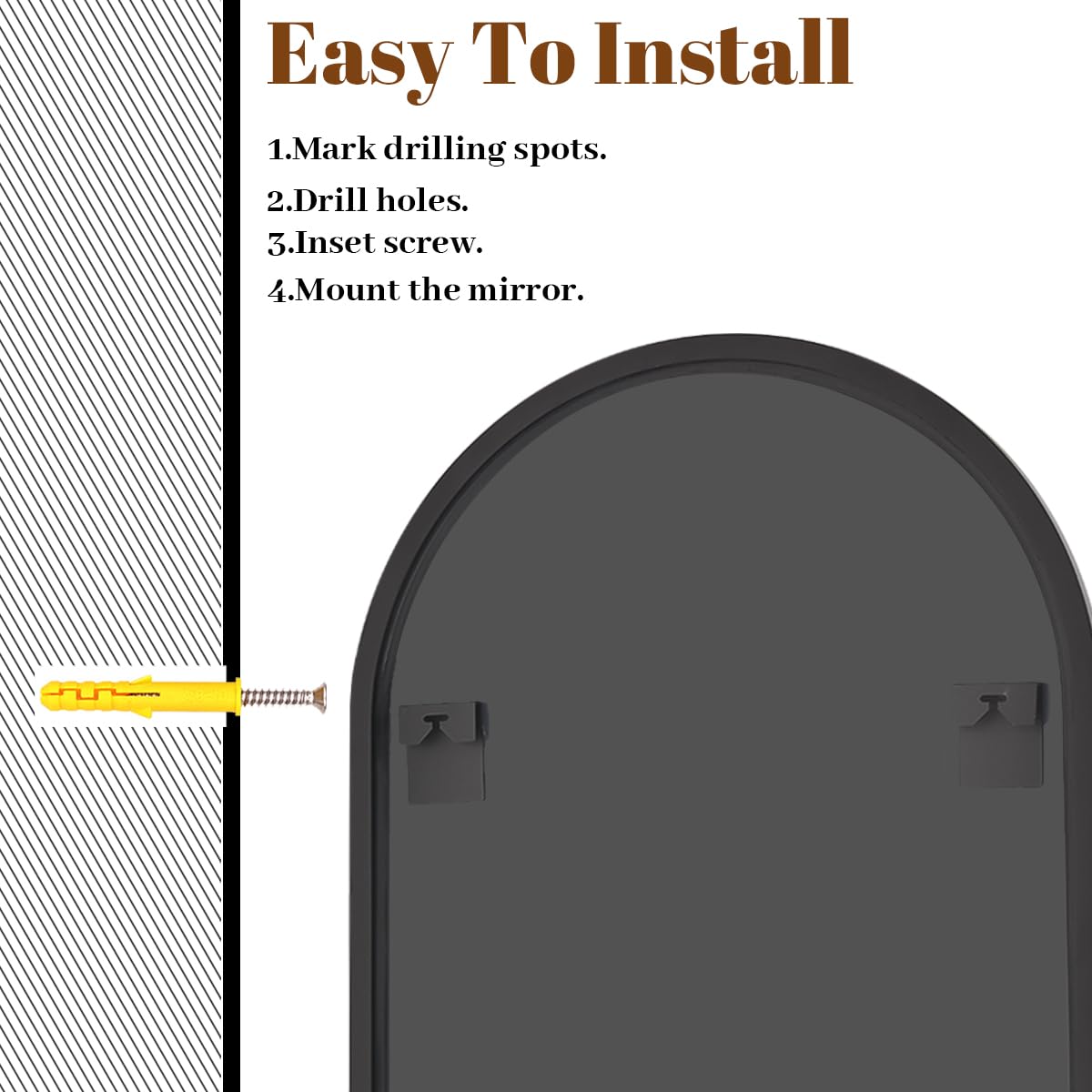 - Easy To Mount: Includes instruction and installation accessories. The pre installed hooks on the back of the arch mirror can easily be hung on the wall of the master bathroom, living room, bedroom, or entryway hallway