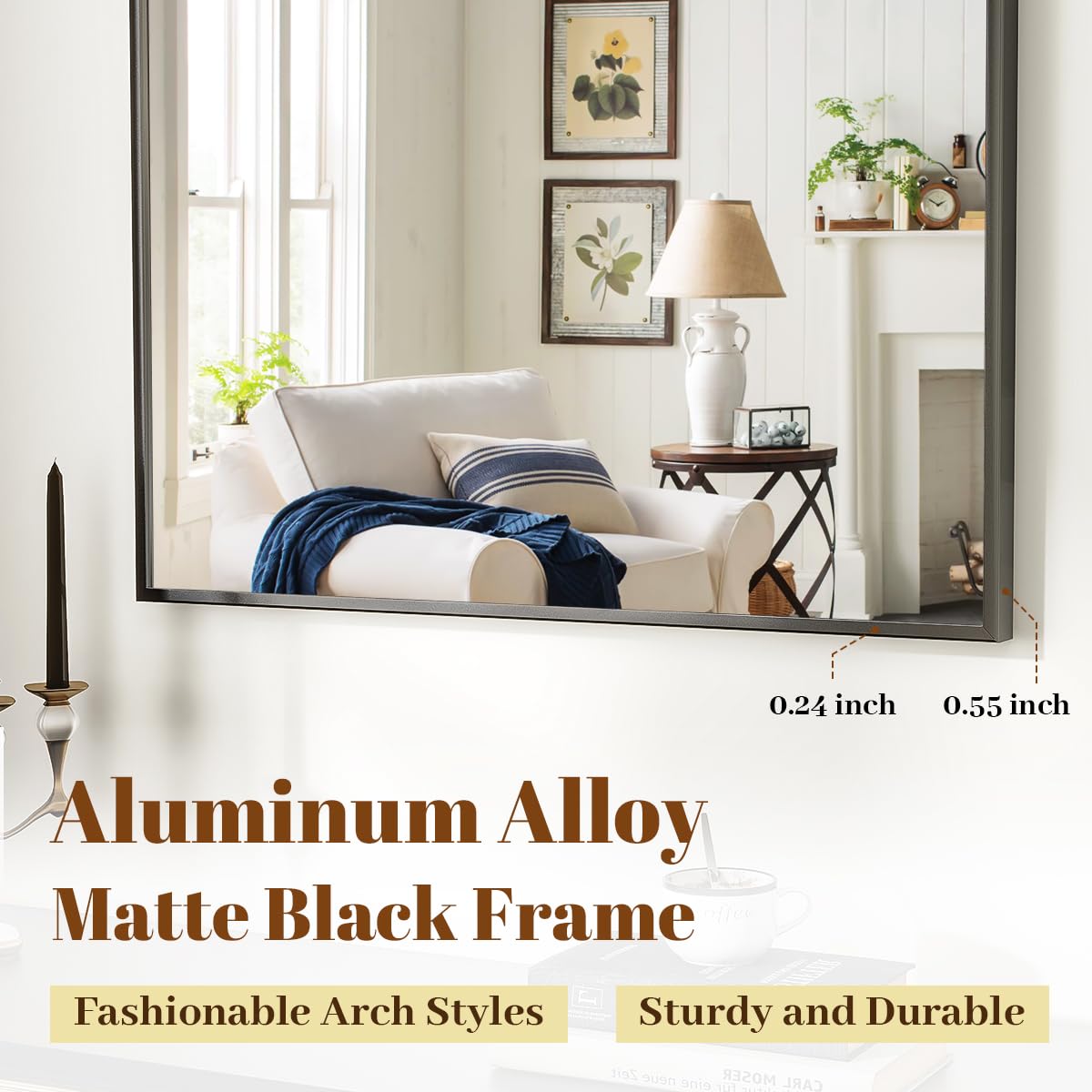 - Metal Frame: The classic black arched wall mirror with the aluminum alloy frame is lightweight and an ideal hanging mirror. The arched curvature design adds a touch of elegance to your bathroom