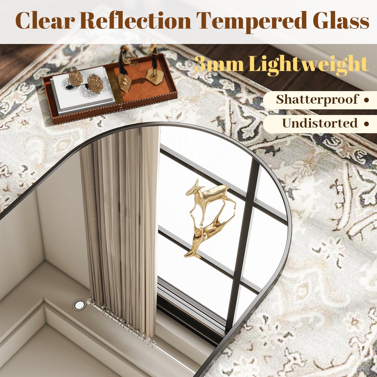 - Sturdy Glass: The arched bathroom mirror made of tempered glass will not distort the image at any angle. Most importantly, the improved glass is sturdy and not easily broken into sharp fragments