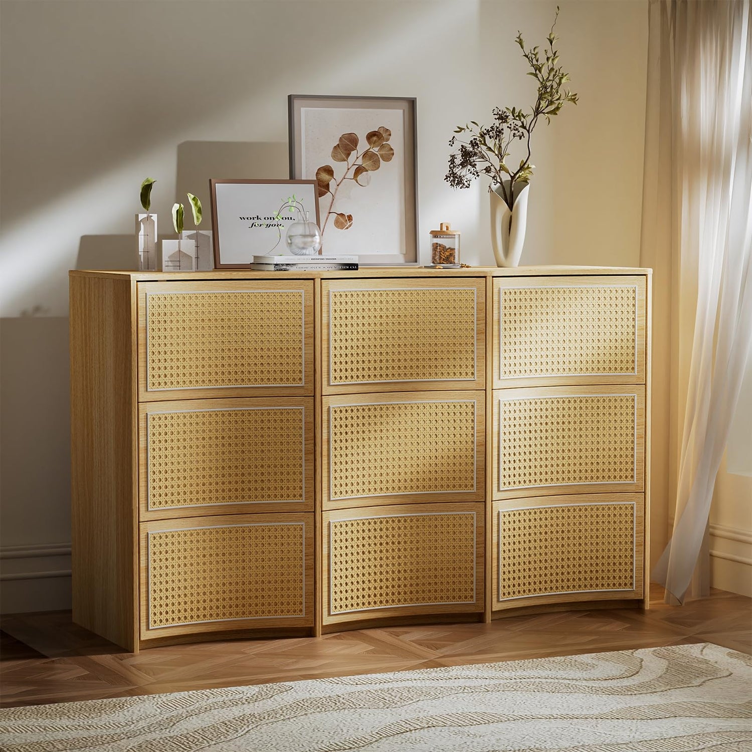 - [Bohemian Woven Design]: Transform your home with our 9 drawers dresser’s stunning Bohemian wave design. With its elegant aesthetics and chic woven details, it seamlessly combines style and functionality. The natural wood grain finish of dresser adds a touch of harmony, creating a warm and inviting atmosphere in any space, like entryway, living room, bedroom, closet, guest room, home office, or nursery room