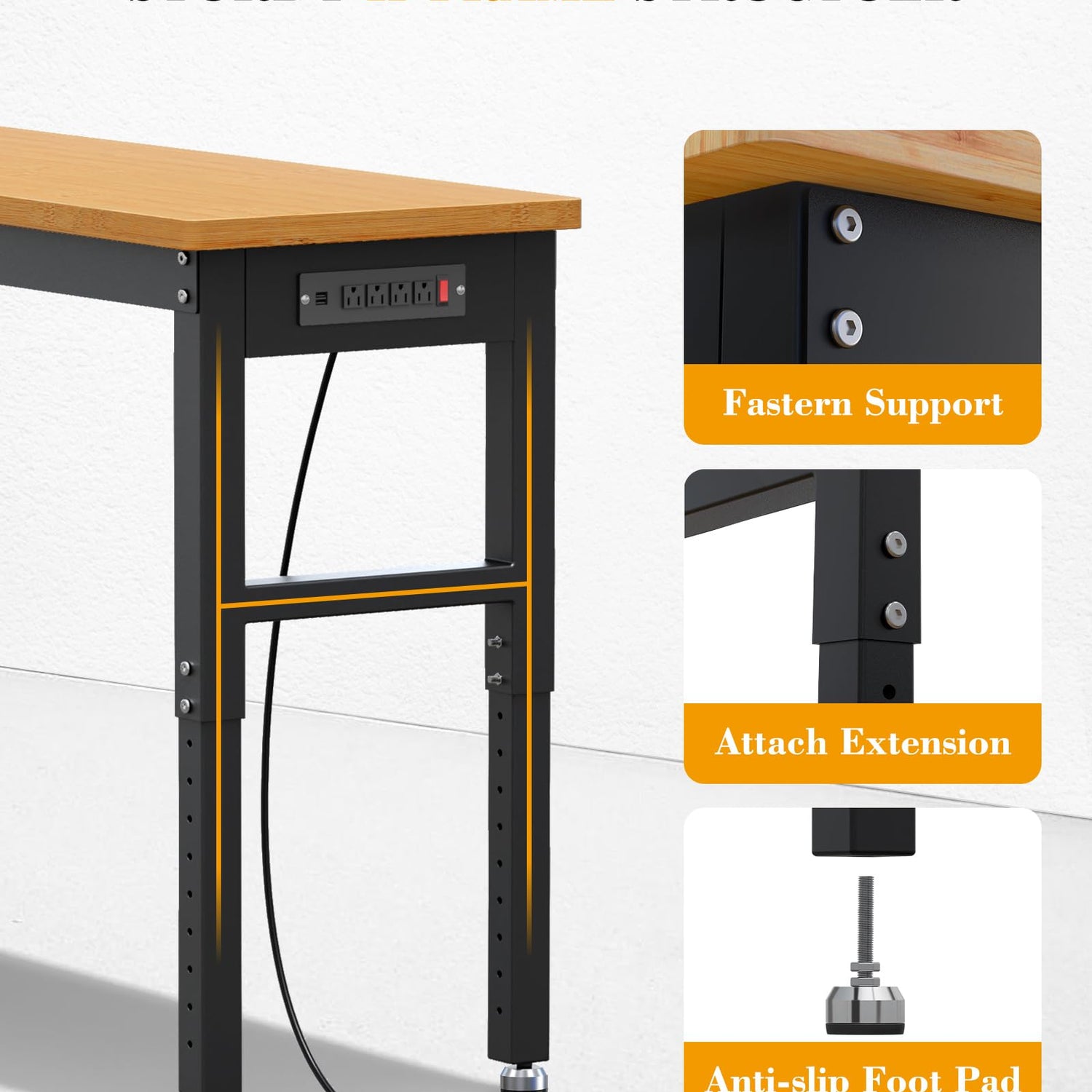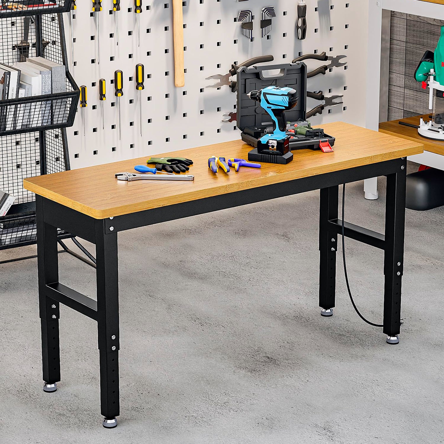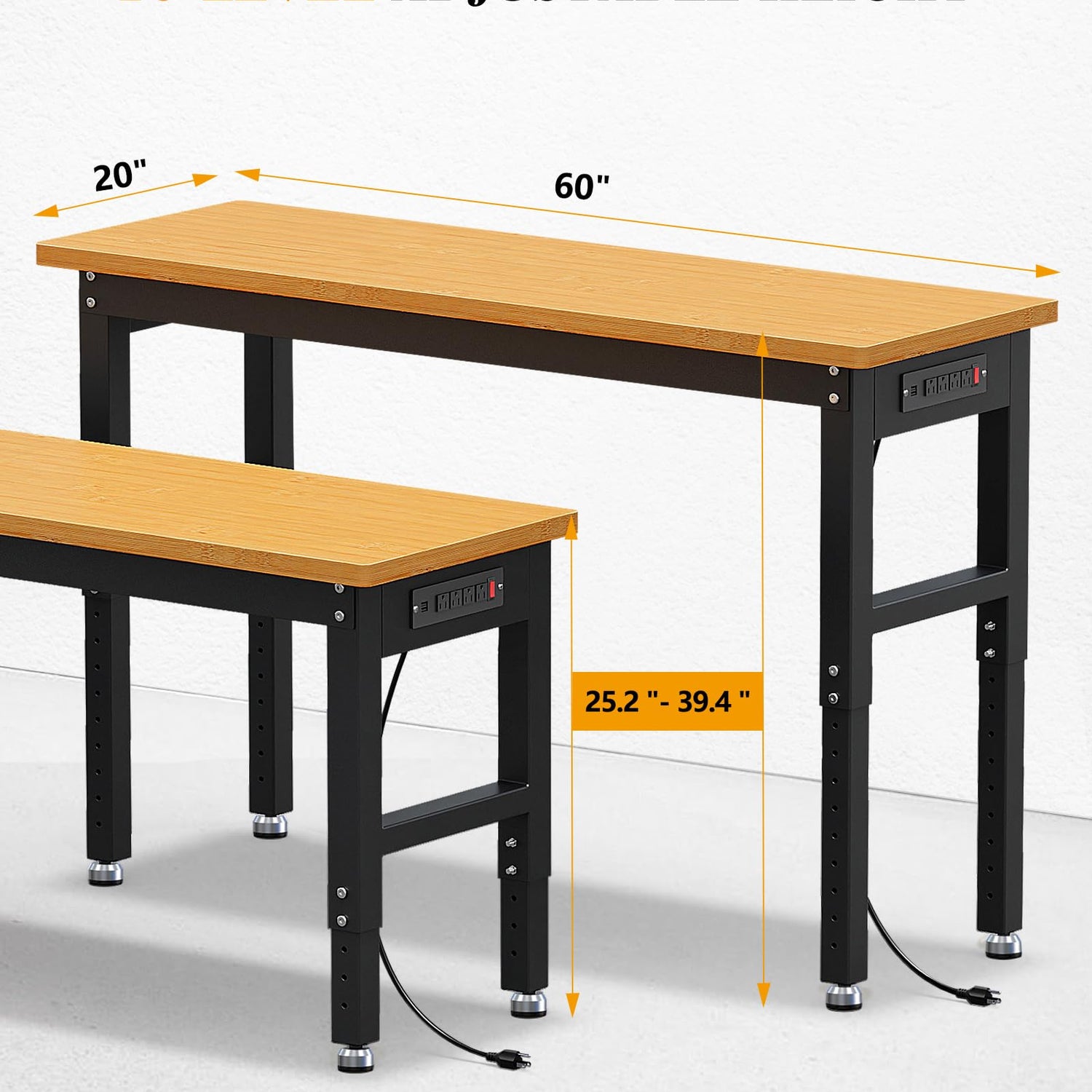 Details: VORTEXTOVE 60" Adjustable Height Workbench 10 Level, 2000lbs Capacity Rubber Wood Top Work Station, Heavy-Duty Work Benches with Power Outlets, for Garage, Shop, Home, Office