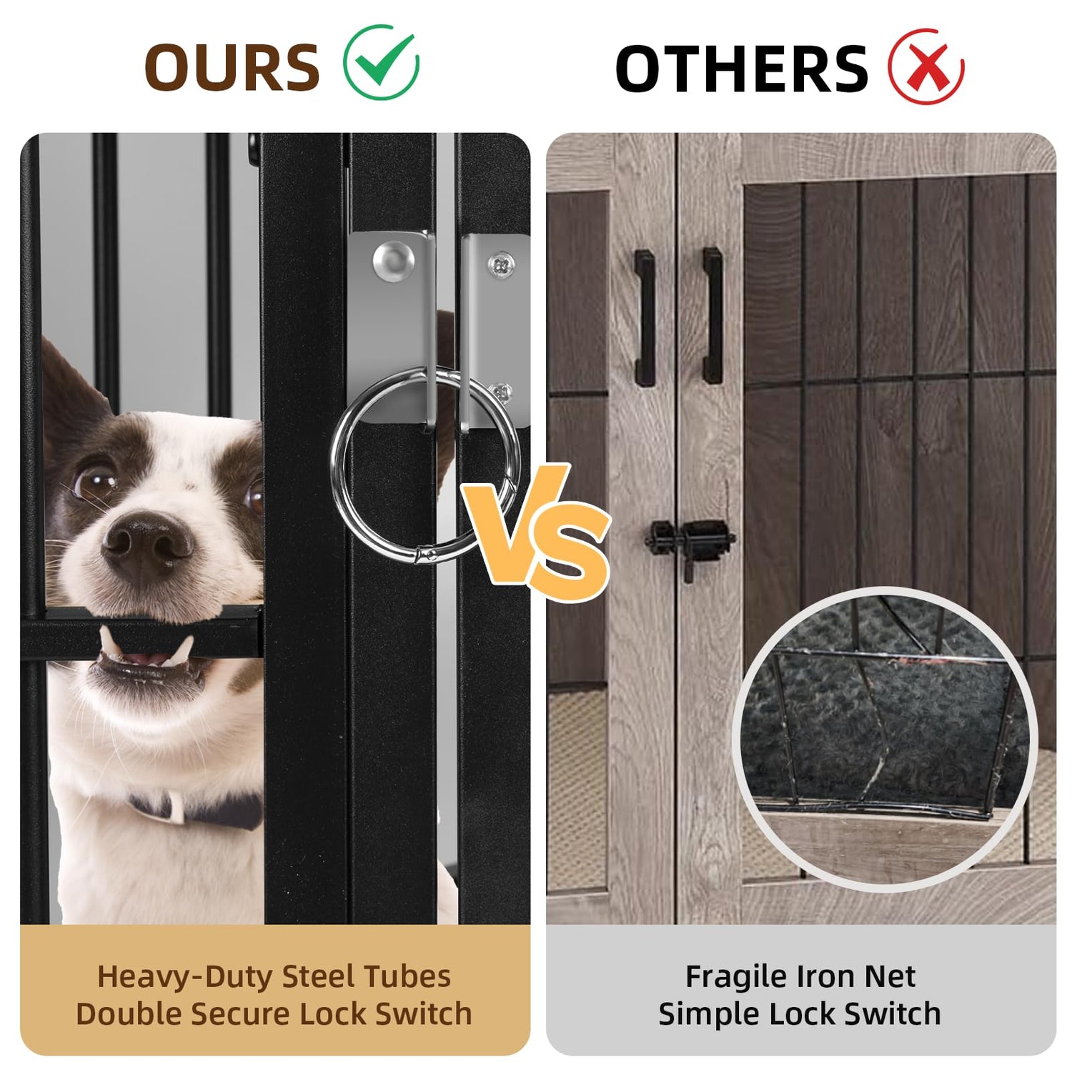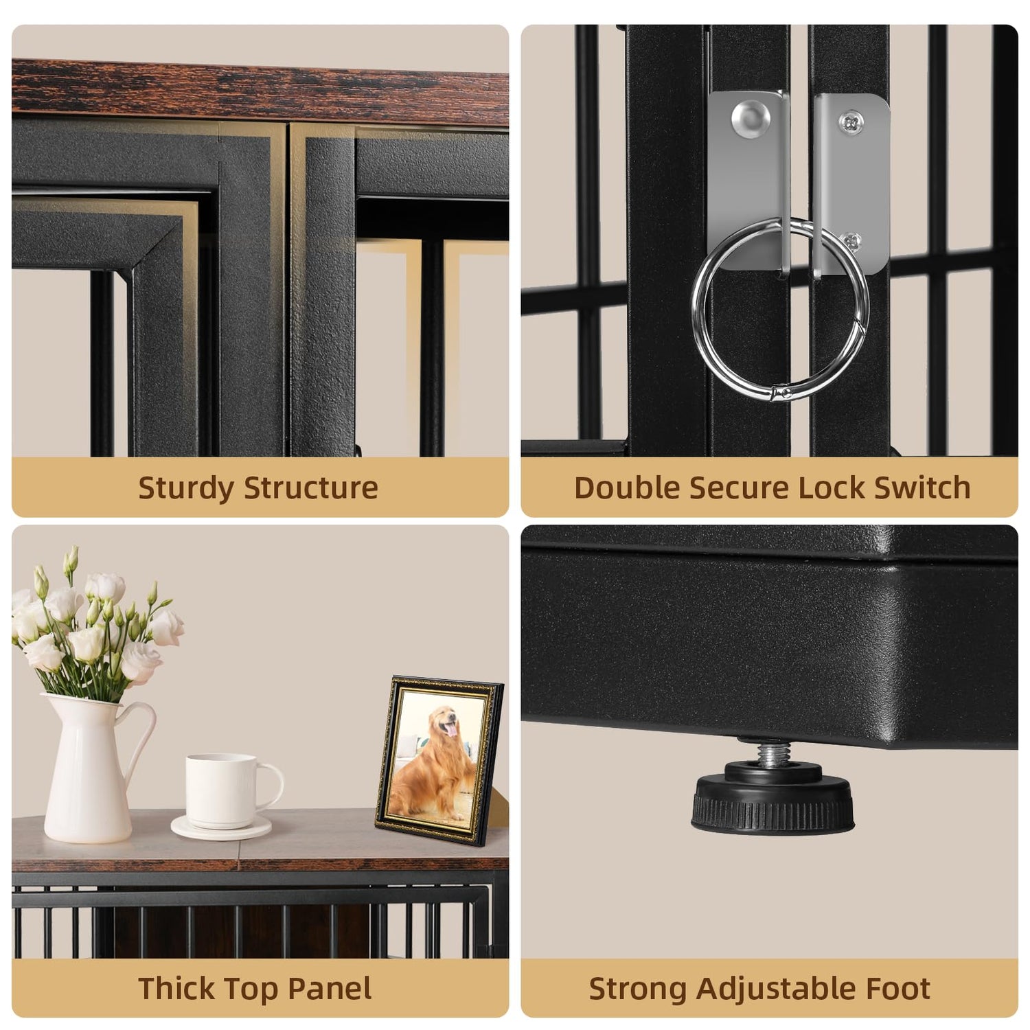 - Heavy Duty Dog Crate: Made of solid heavy iron bars and high-quality engineered wood, our dog crate provides secure containment for your furry friends. Double latches ensure that your dog won't escape easily