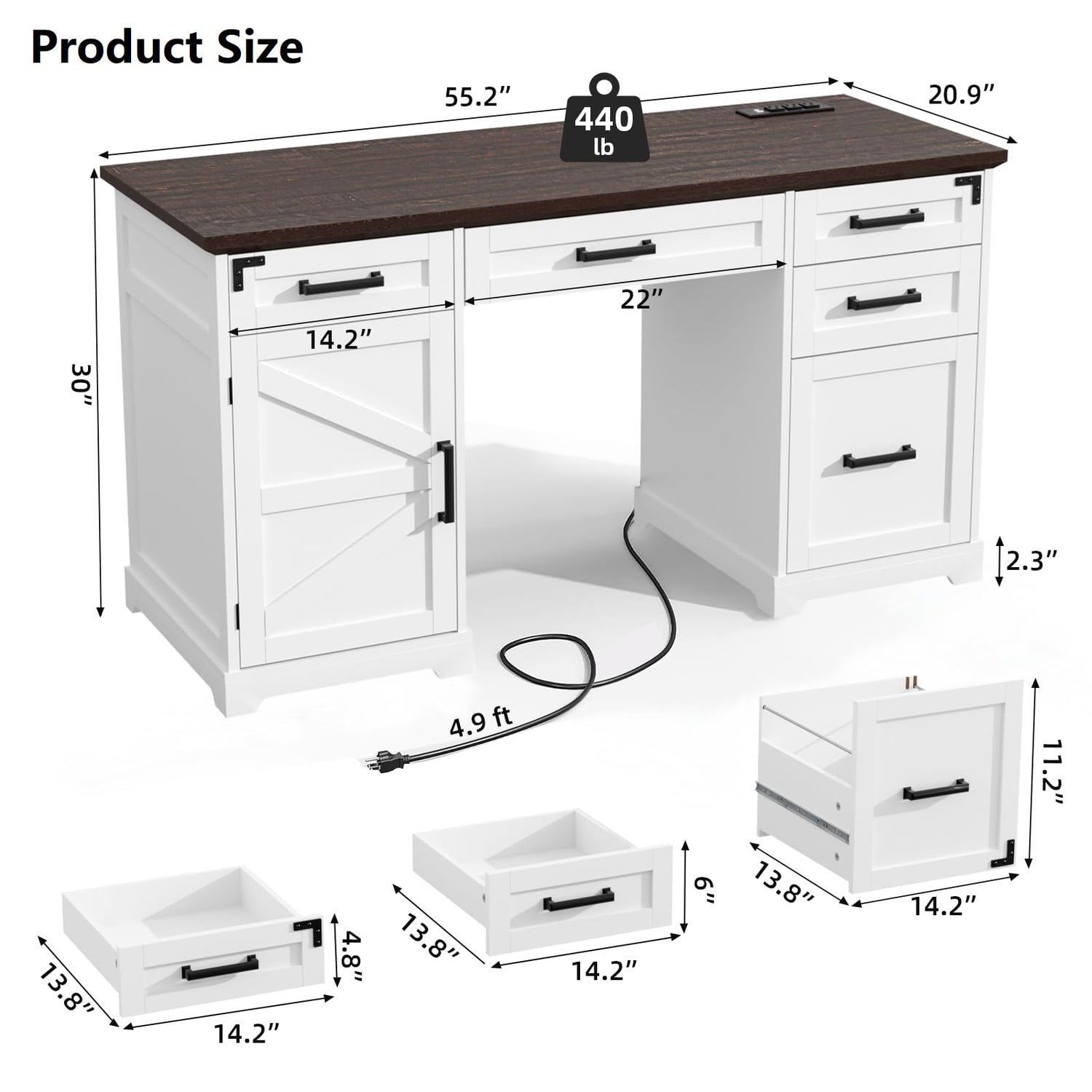 VOWNER 55" Executive Desk, Home Office Desk with Drawers and Storage Cabinet, Farmhouse Wood Desk Workspace for Work Study Writing, Charging Station, Letter/A4 File Drawer, White
