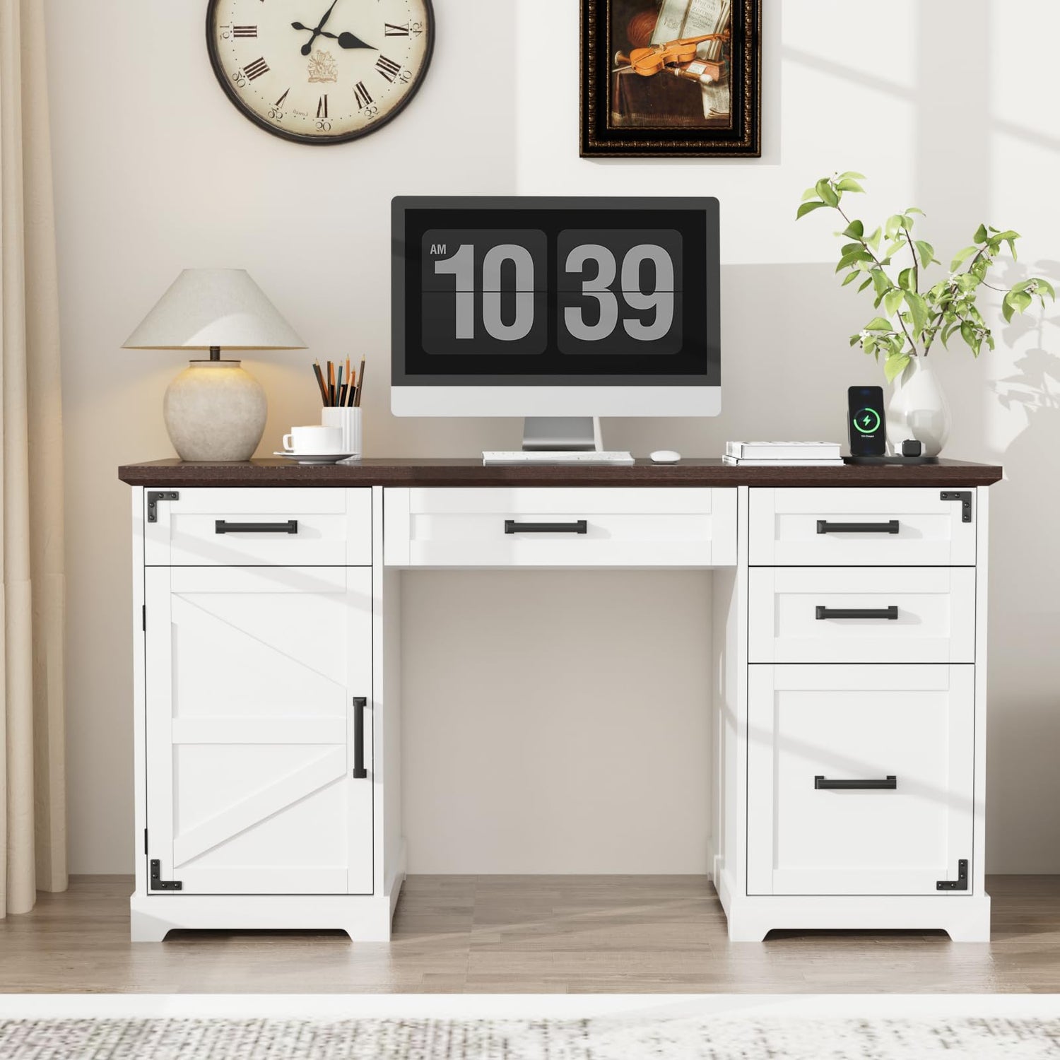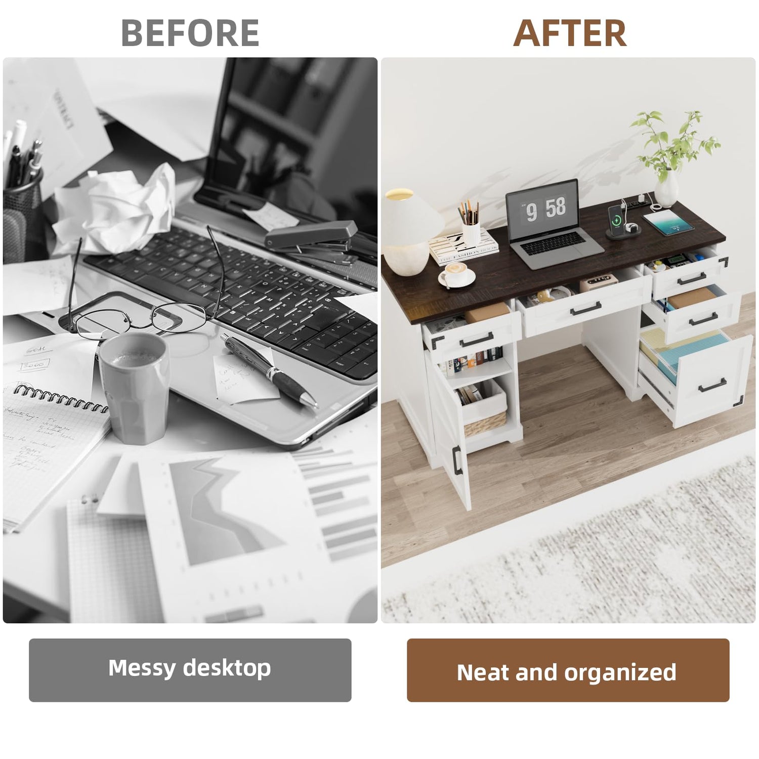 - 【Farmhouse Aesthetic Appearance】: Design of the embossed wood grain texture gives the desk with file drawer a solemn look, the exquisite metal patch decoration provides unique details. Blend of farmhouse and modern style complements any decorative style
