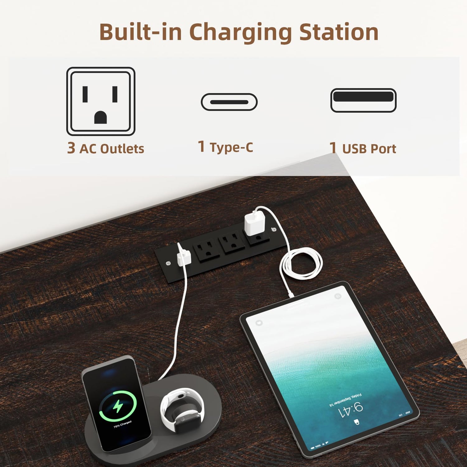- 【Built-In Charging Station】: Integrated 3 AC outlets, 1 USB and 1 Type-C port into desktop, allowing to charge laptop and phone anytime. The charging station is mounted on the right edge of the farmhouse computer desk, allowing you to place items freely