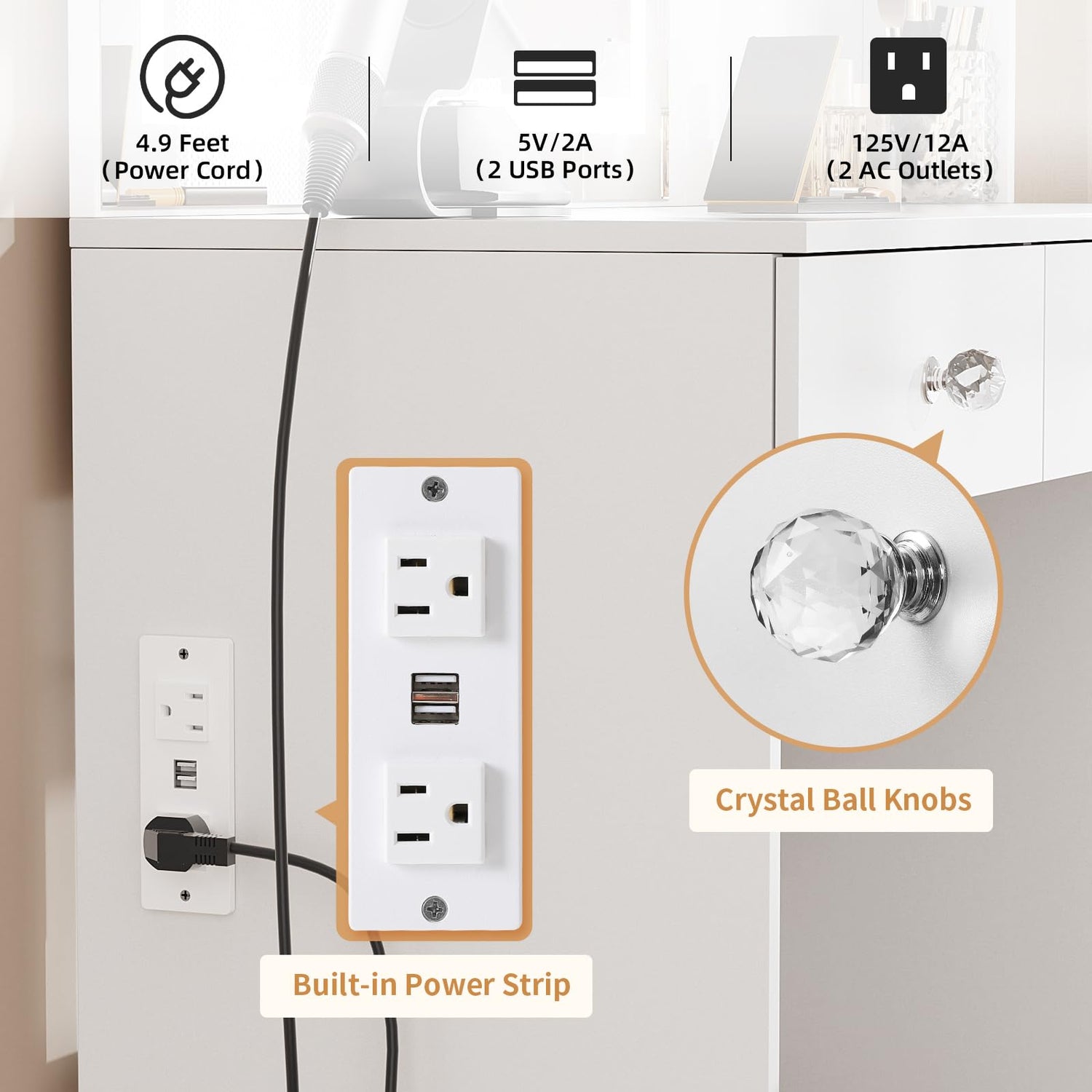 - Built-in Power Outlet: Simplify your beauty routine with the equipped 2 standard plug sockets and 2 USB ports. Easily charge your hair dryers, curling irons, beauty devices, and phones, keeping them within reach while getting ready.