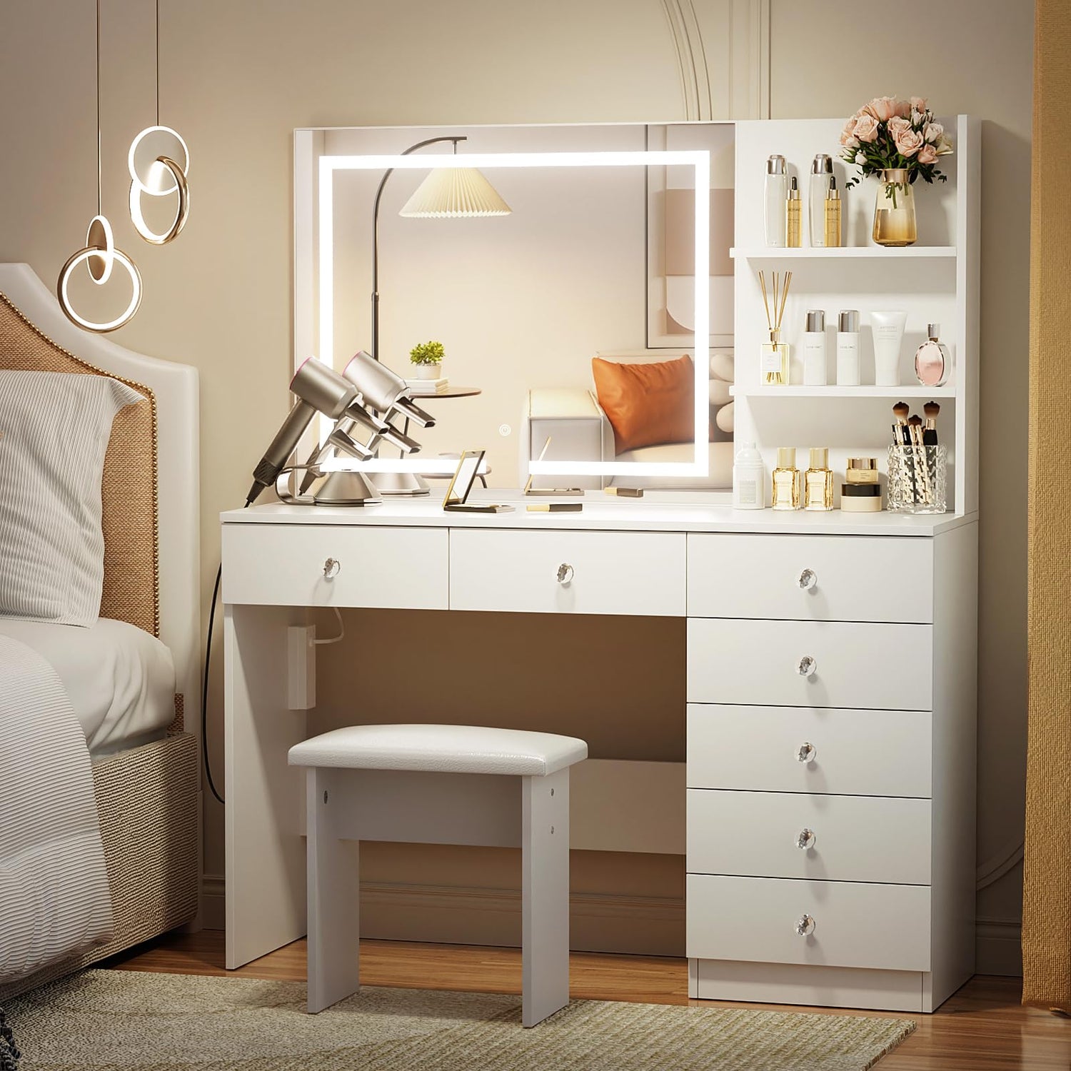 VOWNER Vanity with Lighted Mirror - 47" Makeup Vanity Desk with 7 Drawers, 3 Storage Shelves and Outlet, 3 Color Lighting Modes with Adjustable Brightness, Makeup Desk with Stool for Bedroom, White