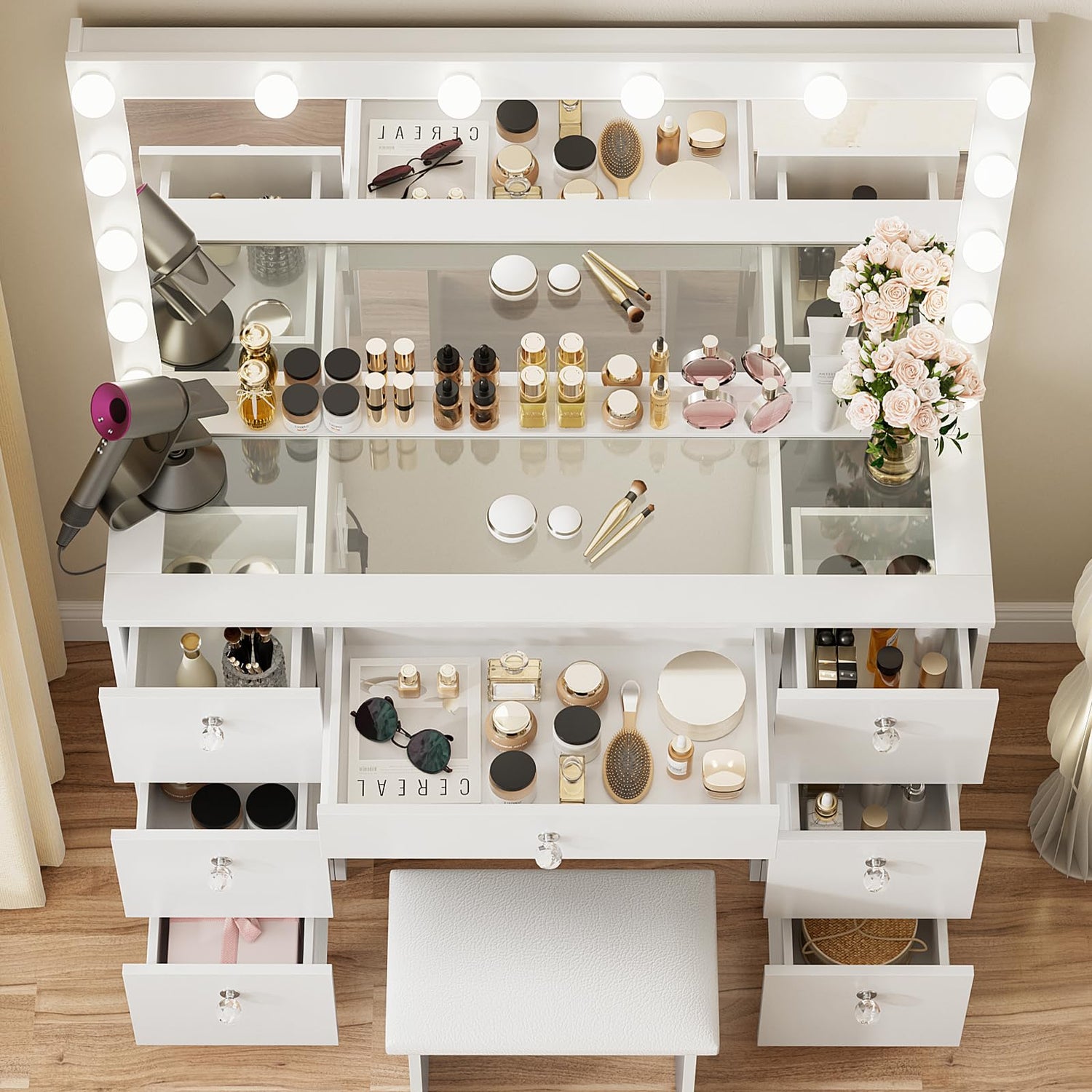 - Super Storage: Our vanity desk features 7 large drawers and spacious glass desktop to store all your beauty essentials.