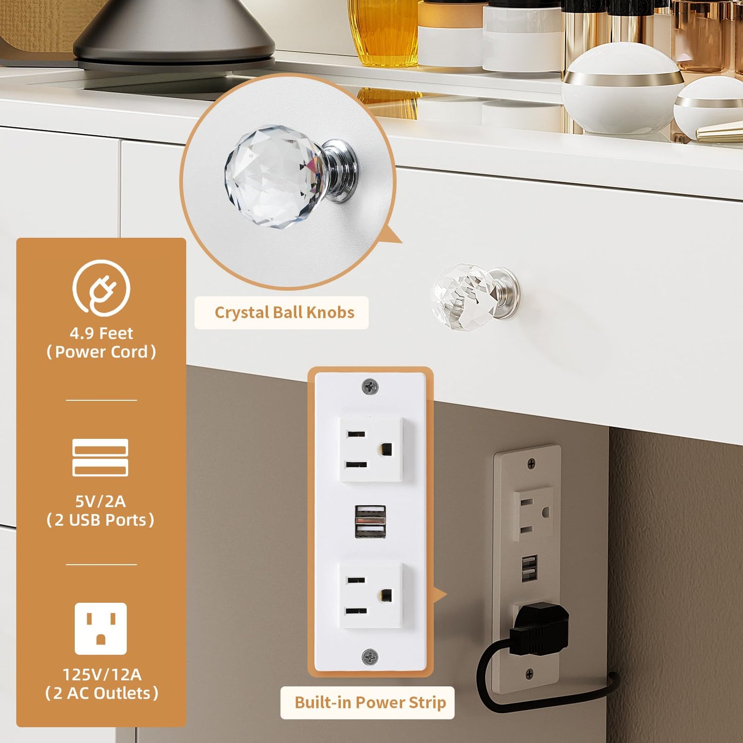 - Convenient Charging Station: Equipped with 2 standard plug sockets and 2 USB ports, this makeup desk allows for easy charging of hair dryers, curling irons, beauty devices, and phones.