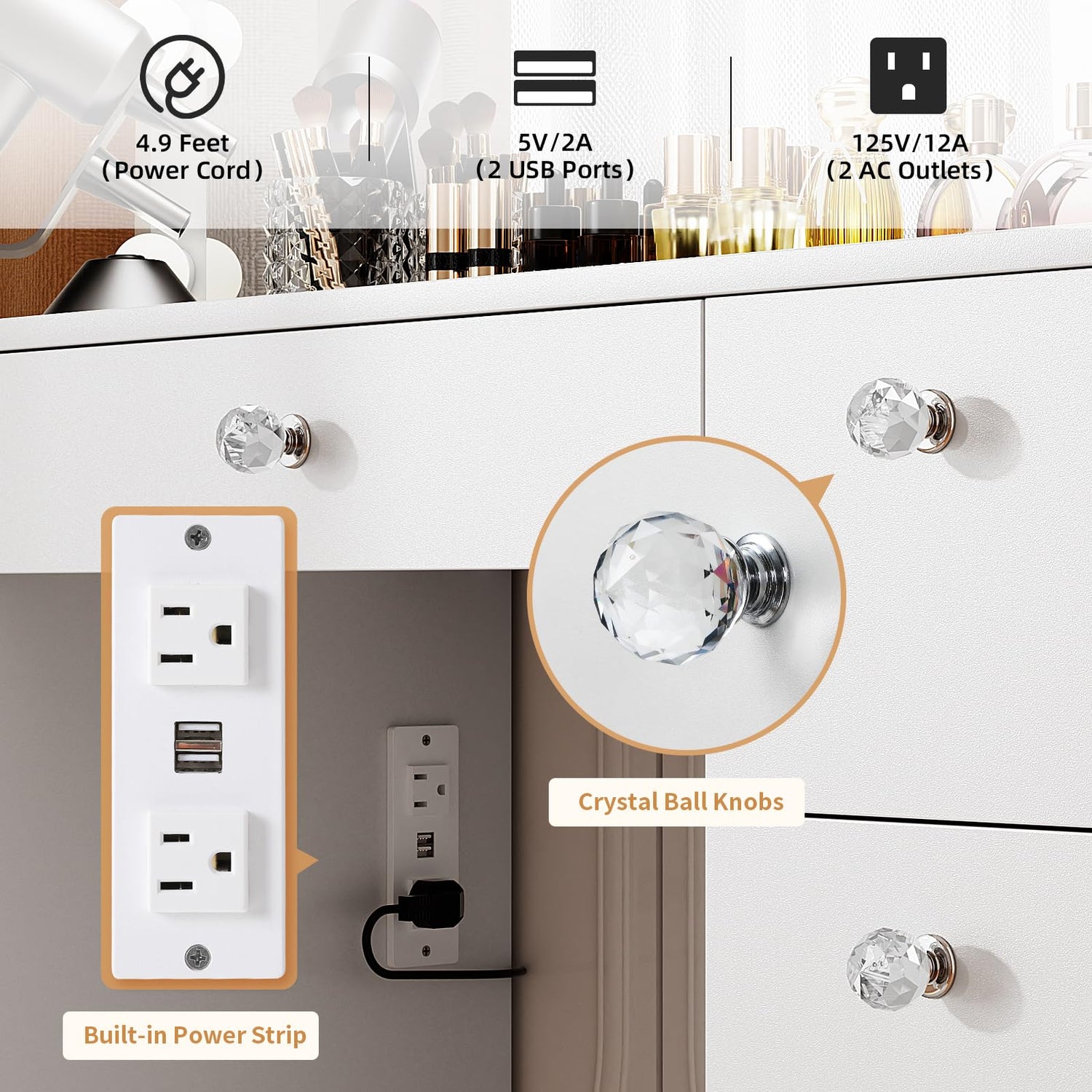 - Convenient Charging Station: Equipped with 2 standard plug sockets and 2 USB ports, this makeup desk allows for easy charging of hair dryers, curling irons, beauty devices, and phones.
